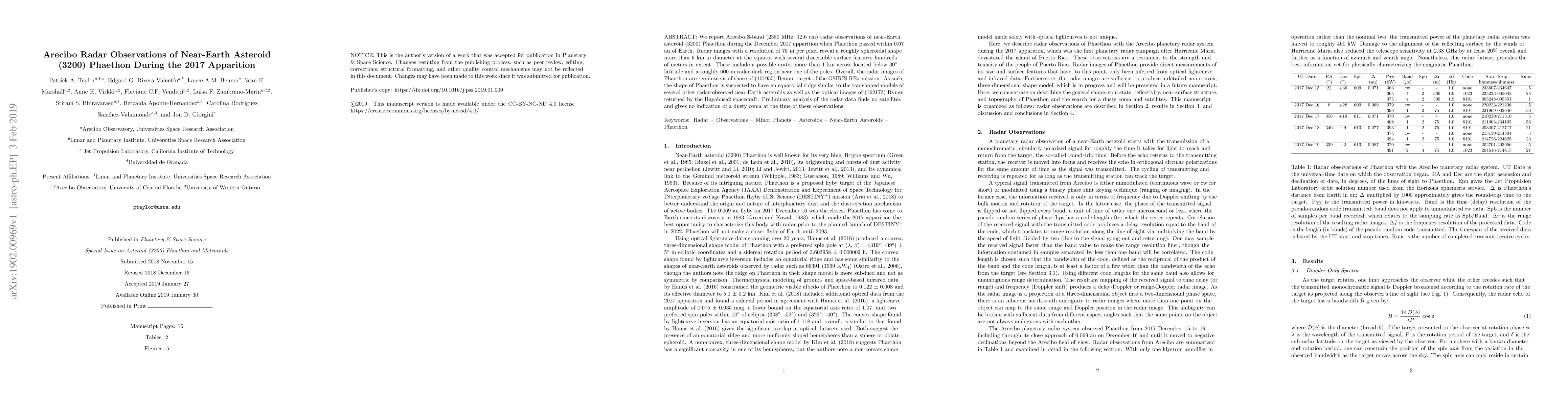 Arecibo radar observations of near-Earth asteroid (3200) Phaethon during its 2017 close approach revealed a roughly spheroidal shape over 6 km in diameter with several surface features, including a possible crater and a radar-dark region. No satellites or dusty coma were detected.