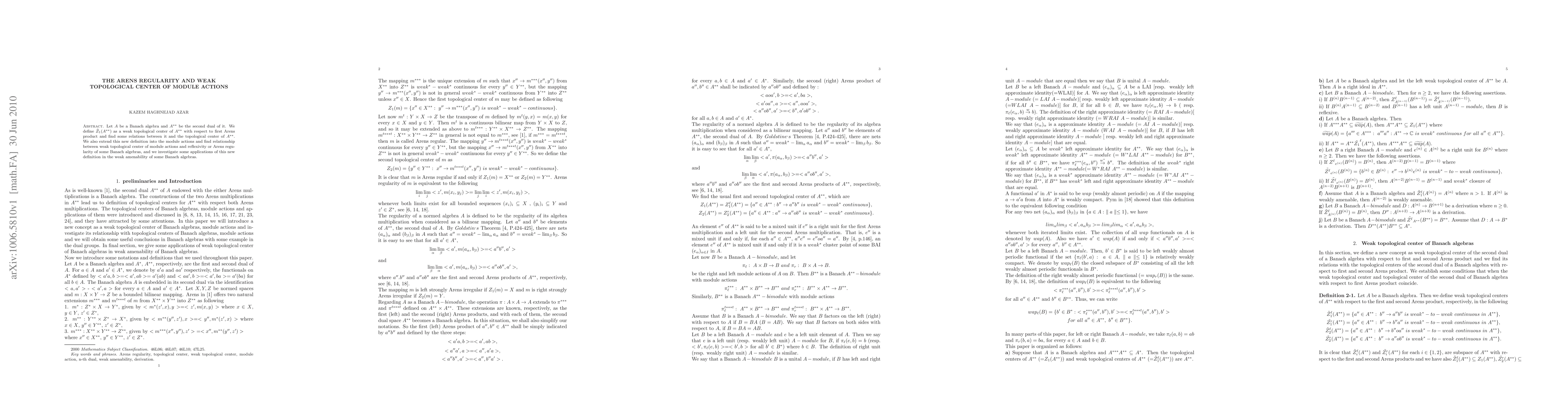 The paper explores the concepts of Arens regularity and weak topological centers in Banach algebras and their extensions to module actions, using dual spaces and second duals.