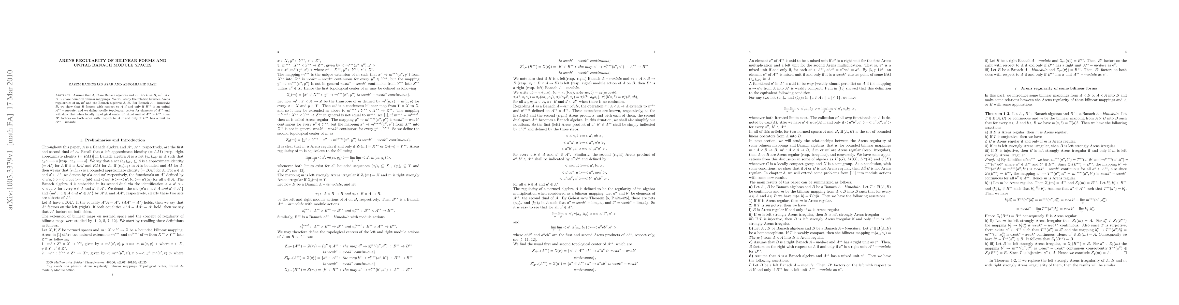 The paper introduces and analyzes the locally topological center for elements of A**, linking it to the factorization properties of Banach modules, and extends classical results on Arens regularity to bilinear forms and module actions.