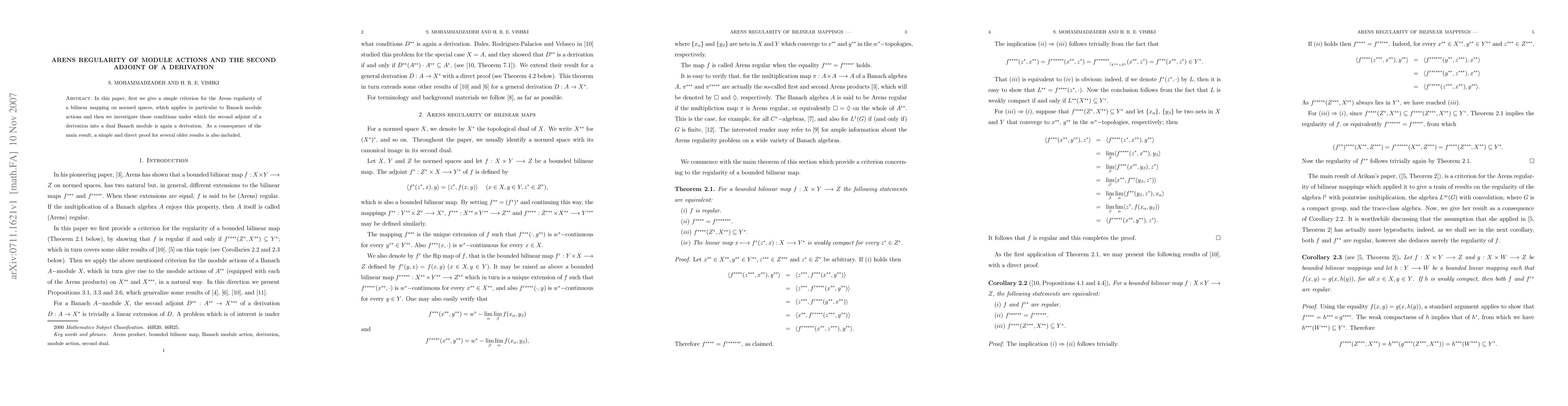 This paper provides a criterion for the Arens regularity of bilinear mappings on normed spaces, particularly for Banach module actions. It also explores conditions for the second adjoint of a derivation into a dual Banach module to be a derivation, offering a new proof for several established results.