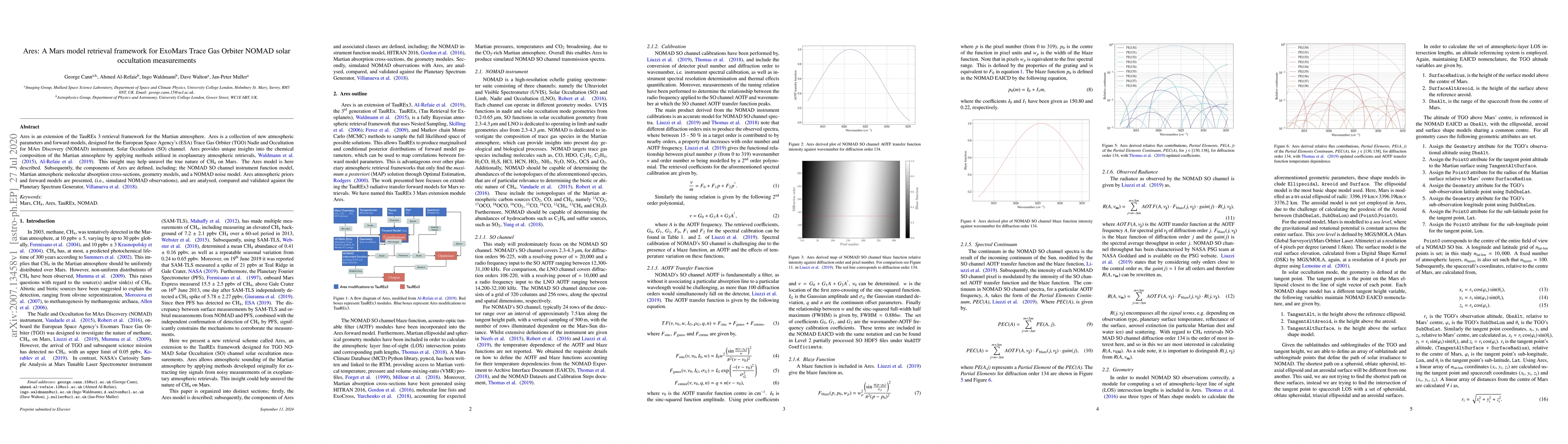 Ares is an extension of the TauREx 3 retrieval framework for the Martian atmosphere. Ares is a collection of new atmospheric parameters and forward models, designed for the European Space Agency's (ESA) Trace Gas Orbiter (TGO) Nadir and Occultation for MArs Discovery (NOMAD) instrument, Solar Occultation (SO) channel. Ares provides unique insights into the chemical composition of the Martian atmosphere by applying methods utilised in exoplanetary atmospheric retrievals, Waldmann et al. (2015), Al-Refaie et al. (2019). This insight may help unravel the true nature of $CH_{4}$ on Mars. The Ares model is here described. Subsequently, the components of Ares are defined, including; the NOMAD SO channel instrument function model, Martian atmospheric molecular absorption cross-sections, geometry models, and a NOMAD noise model. Ares atmospheric priors and forward models are presented, (i.e., simulated NOMAD observations), and are analysed, compared and validated against the Planetary Spectrum Generator, Villanueva et al. (2018).