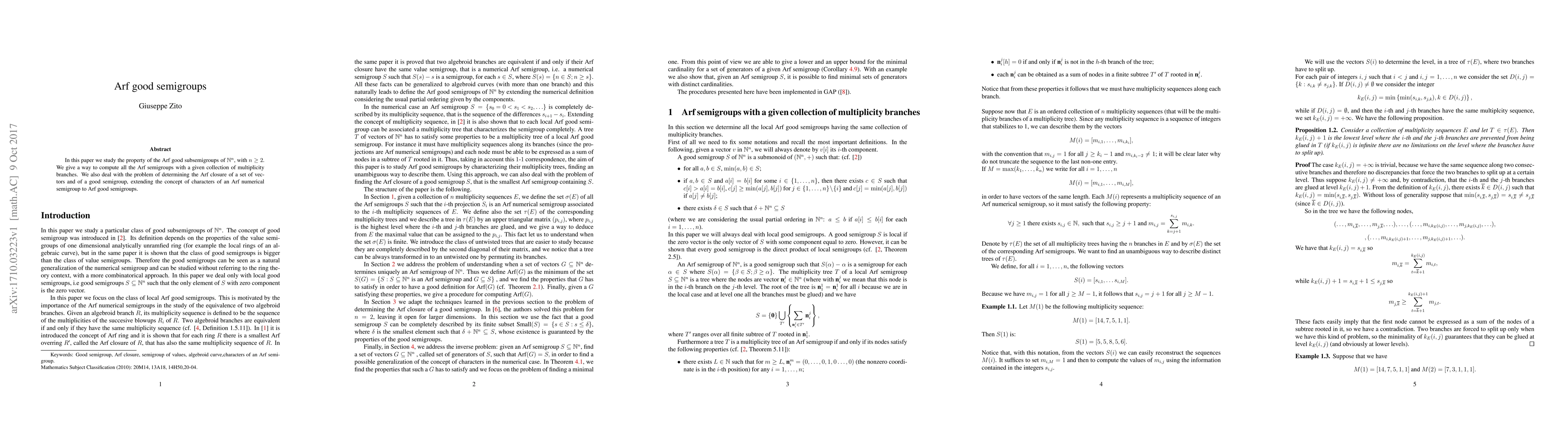 This paper investigates Arf good subsemigroups of $\mathbb{N}^n$ and provides a method to compute them based on multiplicity branches. It also explores the Arf closure of sets and extends the concept of characters from Arf numerical semigroups to Arf good semigroups.