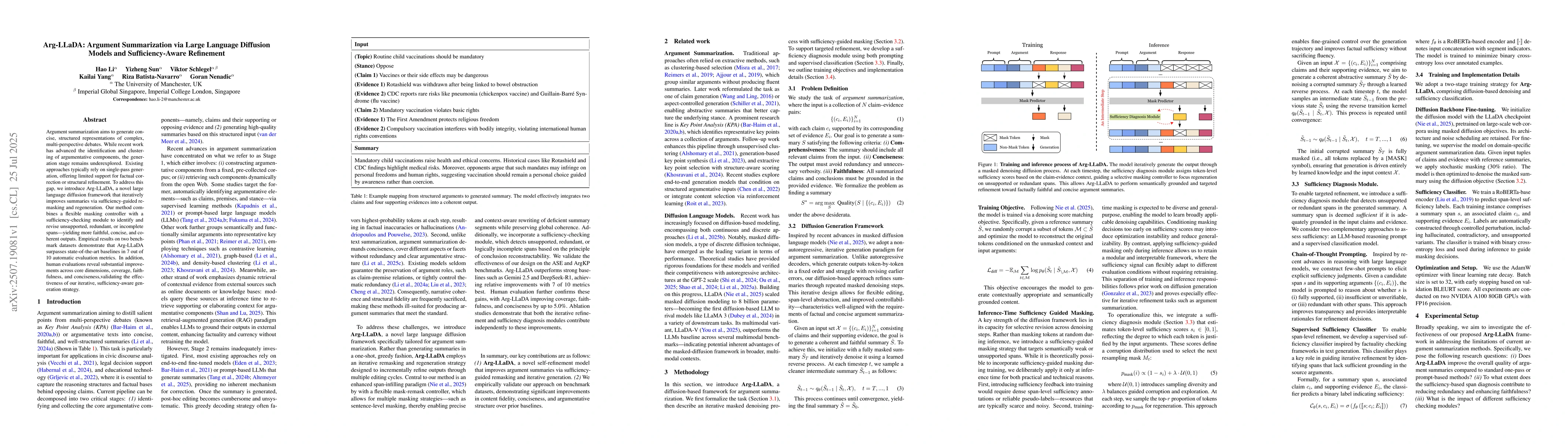 Argument summarization aims to generate concise, structured representations of complex, multi-perspective debates. While recent work has advanced the identification and clustering of argumentative components, the generation stage remains underexplored. Existing approaches typically rely on single-pass generation, offering limited support for factual correction or structural refinement. To address this gap, we introduce Arg-LLaDA, a novel large language diffusion framework that iteratively improves summaries via sufficiency-guided remasking and regeneration. Our method combines a flexible masking controller with a sufficiency-checking module to identify and revise unsupported, redundant, or incomplete spans, yielding more faithful, concise, and coherent outputs. Empirical results on two benchmark datasets demonstrate that Arg-LLaDA surpasses state-of-the-art baselines in 7 out of 10 automatic evaluation metrics. In addition, human evaluations reveal substantial improvements across core dimensions, coverage, faithfulness, and conciseness, validating the effectiveness of our iterative, sufficiency-aware generation strategy.