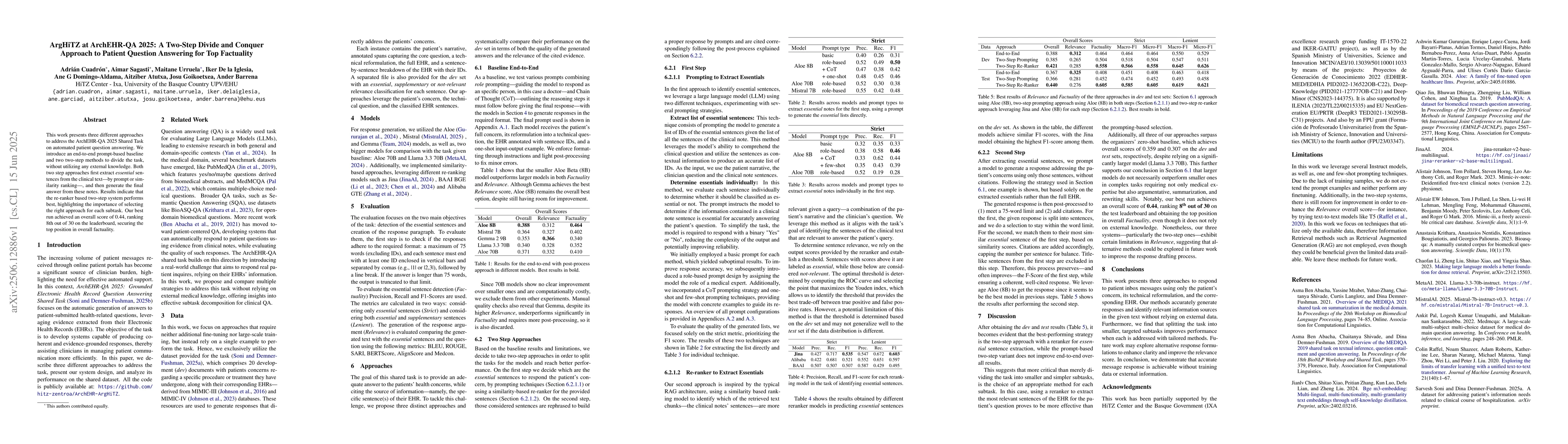 This work presents three different approaches to address the ArchEHR-QA 2025 Shared Task on automated patient question answering. We introduce an end-to-end prompt-based baseline and two two-step methods to divide the task, without utilizing any external knowledge. Both two step approaches first extract essential sentences from the clinical text, by prompt or similarity ranking, and then generate the final answer from these notes. Results indicate that the re-ranker based two-step system performs best, highlighting the importance of selecting the right approach for each subtask. Our best run achieved an overall score of 0.44, ranking 8th out of 30 on the leaderboard, securing the top position in overall factuality.