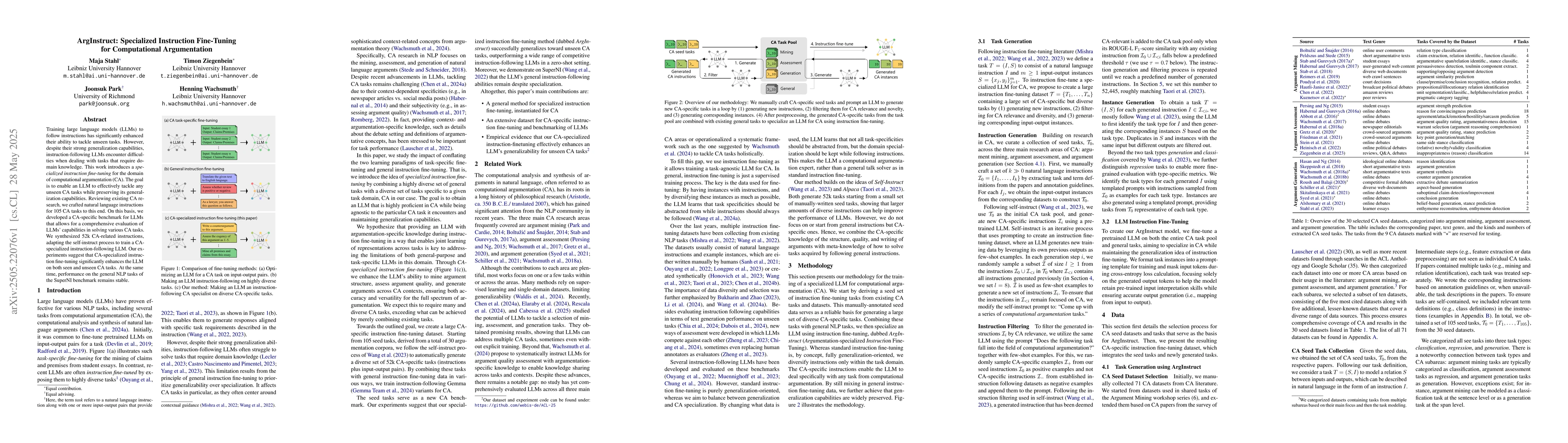 The research crafted natural language instructions for 105 computational argumentation tasks and synthesized 52k CA-related instructions, adapting the self-instruct process to train a computational argumentation (CA)-specialized instruction-following large language model (LLM).
