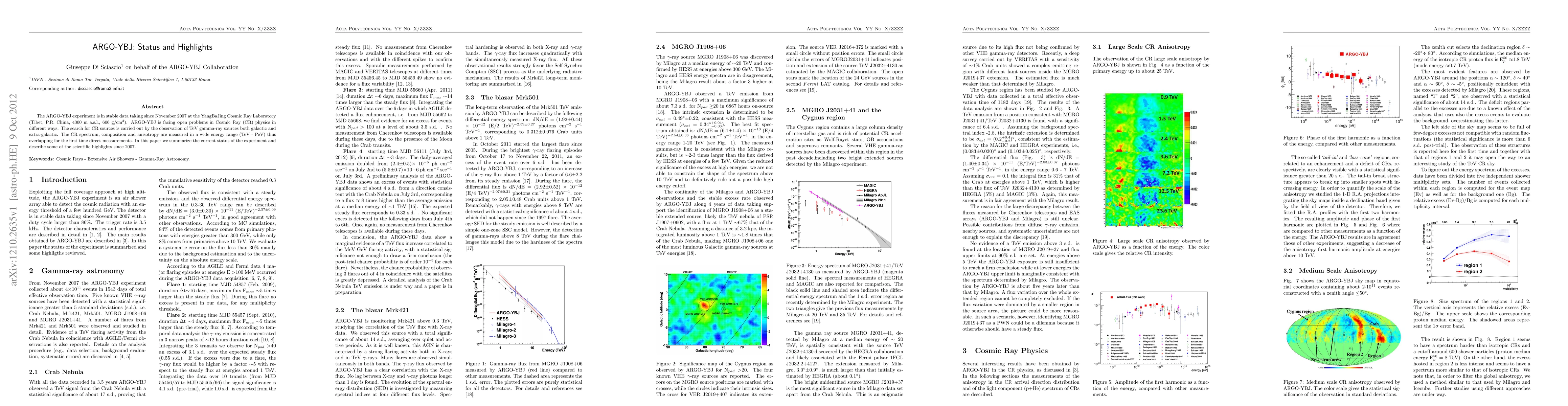 The ARGO-YBJ experiment has been collecting cosmic ray data since 2007, providing insights into CR sources, spectrum, composition, and anisotropy across a wide energy range. The experiment has made significant scientific highlights, including direct measurements of the CR spectrum and composition for the first time.