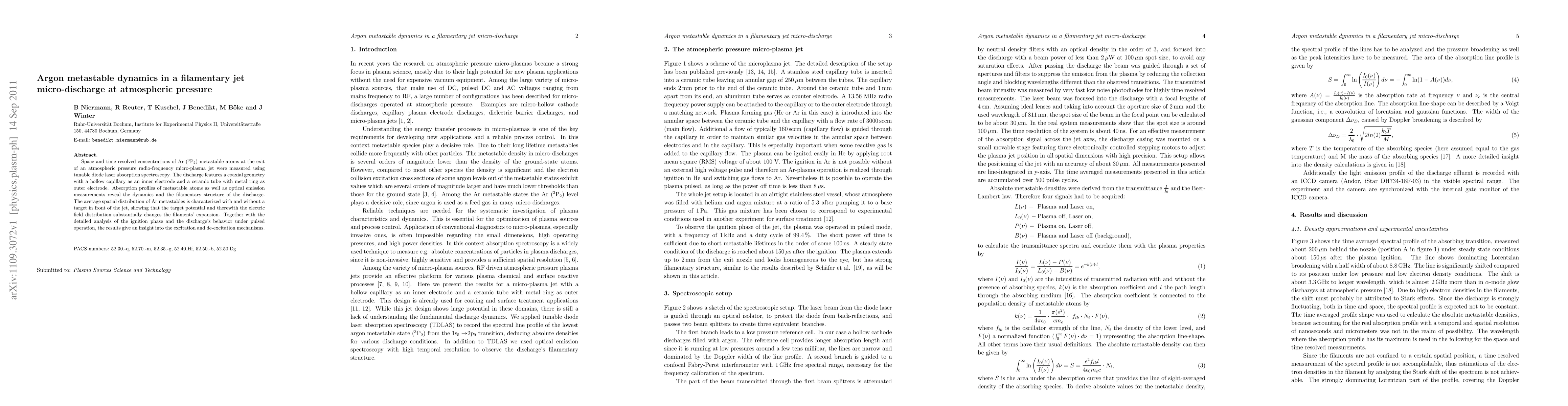 This paper investigates the spatial and temporal dynamics of argon metastable atoms in a filamentary micro-plasma jet at atmospheric pressure using tunable diode laser absorption spectroscopy. The study reveals the influence of a target on the filamentary structure and the discharge's behavior, providing insights into excitation and de-excitation mechanisms.