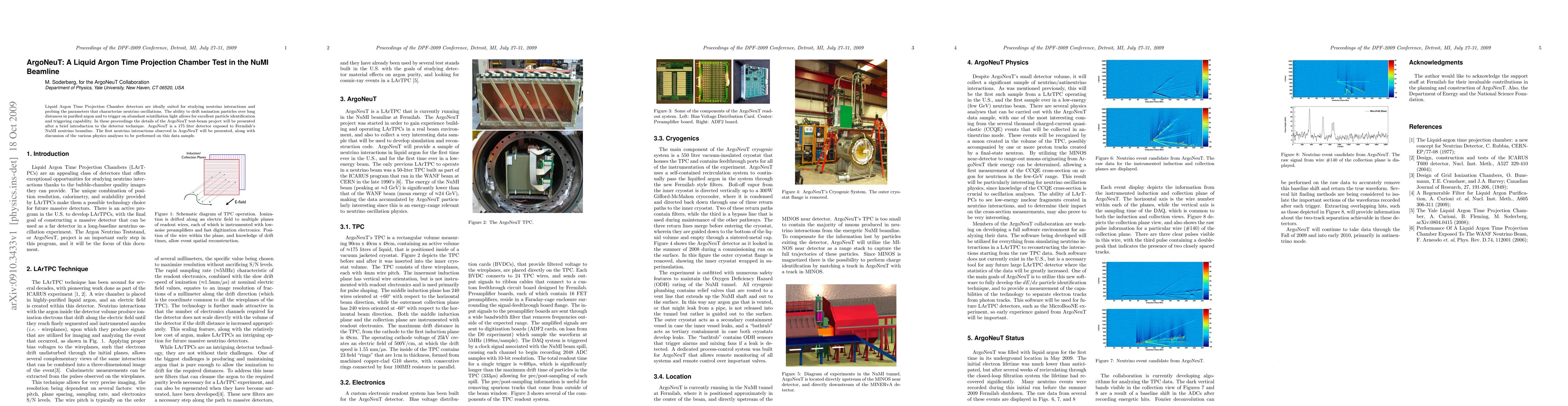ArgoNeuT is a 175-liter liquid argon time projection chamber deployed in the NuMI beamline to study neutrino interactions, offering superior particle identification and triggering. Initial observations from the detector reveal promising data for neutrino oscillation parameter analyses.