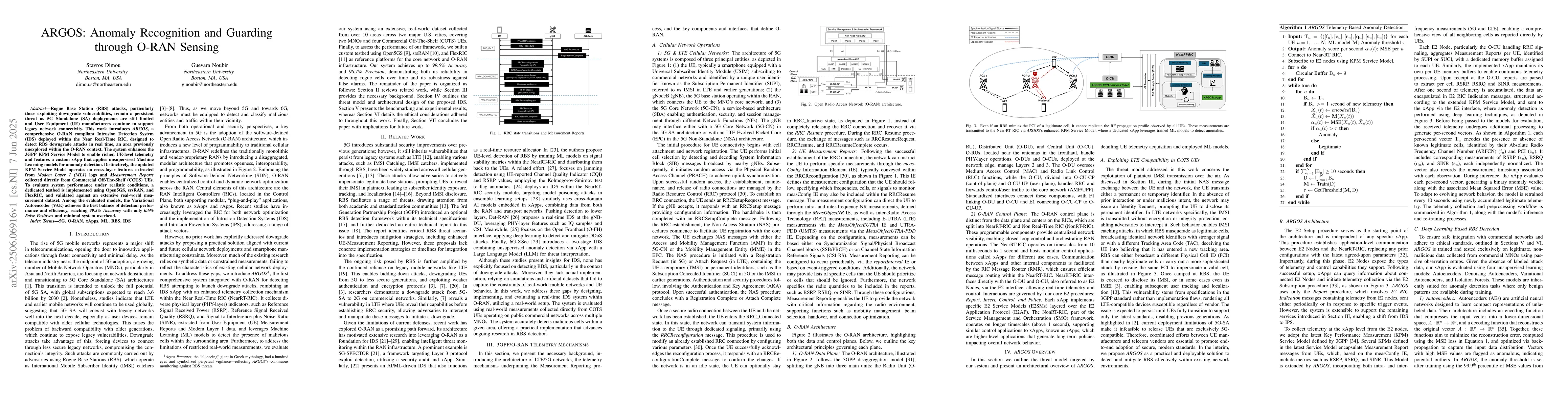 Rogue Base Station (RBS) attacks, particularly those exploiting downgrade vulnerabilities, remain a persistent threat as 5G Standalone (SA) deployments are still limited and User Equipment (UE) manufacturers continue to support legacy network connectivity. This work introduces ARGOS, a comprehensive O-RAN compliant Intrusion Detection System (IDS) deployed within the Near Real-Time RIC, designed to detect RBS downgrade attacks in real time, an area previously unexplored within the O-RAN context. The system enhances the 3GPP KPM Service Model to enable richer, UE-level telemetry and features a custom xApp that applies unsupervised Machine Learning models for anomaly detection. Distinctively, the updated KPM Service Model operates on cross-layer features extracted from Modem Layer 1 (ML1) logs and Measurement Reports collected directly from Commercial Off-The-Shelf (COTS) UEs. To evaluate system performance under realistic conditions, a dedicated testbed is implemented using Open5GS, srsRAN, and FlexRIC, and validated against an extensive real-world measurement dataset. Among the evaluated models, the Variational Autoencoder (VAE) achieves the best balance of detection performance and efficiency, reaching 99.5% Accuracy with only 0.6% False Positives and minimal system overhead.