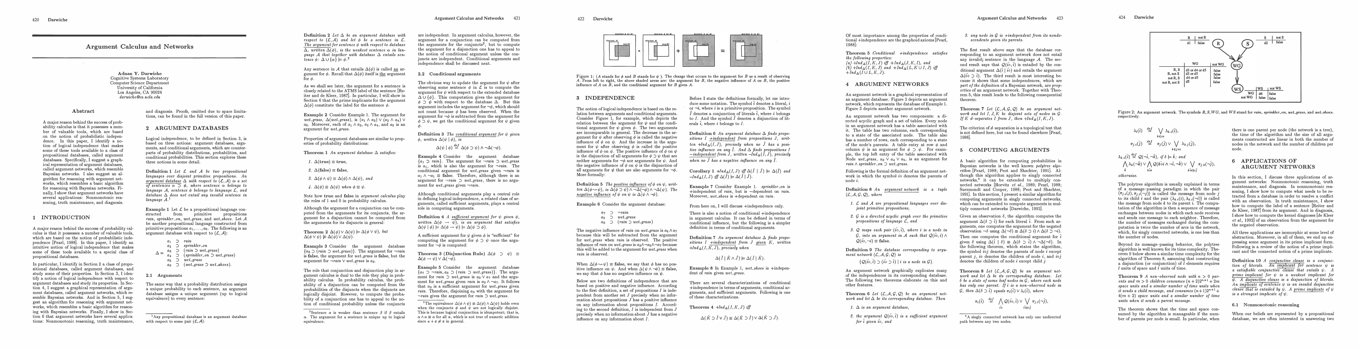 This paper introduces a concept of logical independence for argument databases, proposing argument networks as a graphical representation akin to Bayesian networks. It presents an algorithm for reasoning with these networks and demonstrates their applications in nonmonotonic reasoning, truth maintenance, and diagnosis.