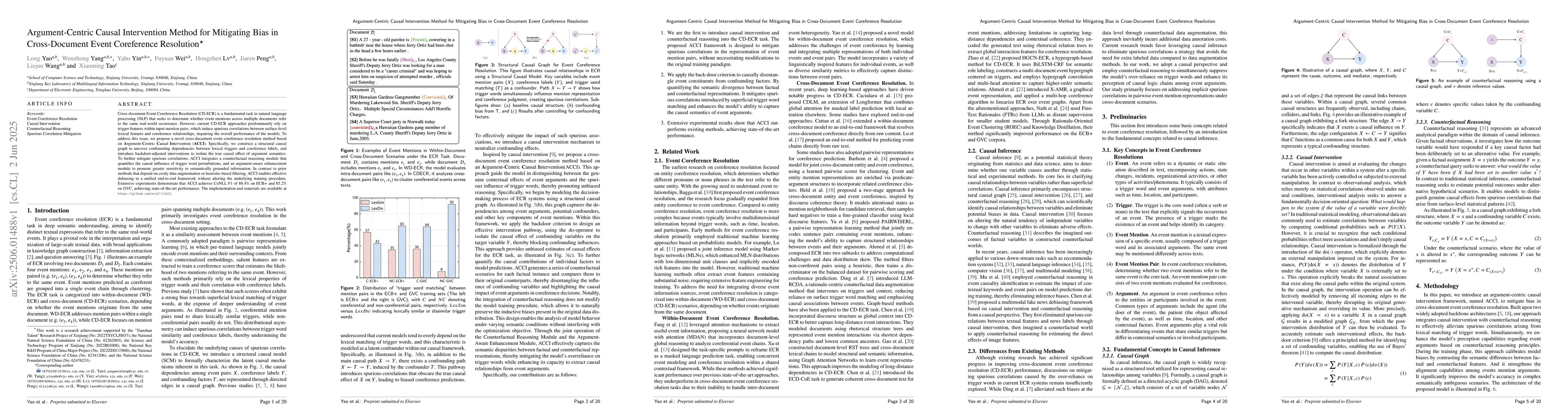 A new method called Argument-Centric Causal Intervention (ACCI) is proposed to mitigate bias in cross-document event coreference resolution, achieving state-of-the-art performance with 88.4% CoNLL F1 score.