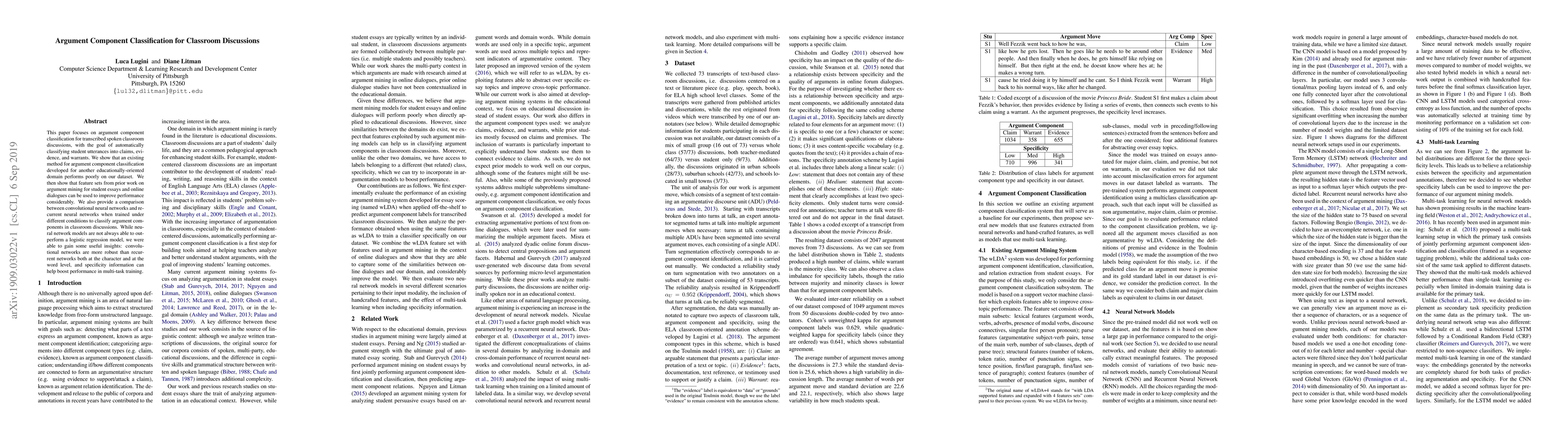 This paper explores the automatic classification of argument components in classroom discussions, finding that existing methods perform poorly but can be improved using features from argument mining in student essays and online dialogues. It compares neural network models and finds convolutional networks more robust, while noting that logistic regression can sometimes outperform them, but multi-task training with specificity information enhances performance.