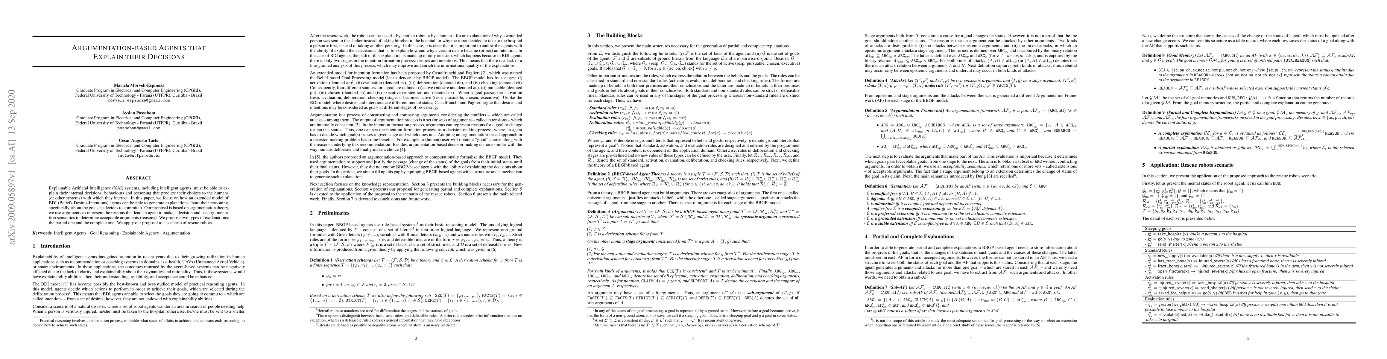 Explainable Artificial Intelligence (XAI) systems, including intelligent agents, must be able to explain their internal decisions, behaviours and reasoning that produce their choices to the humans (or other systems) with which they interact. In this paper, we focus on how an extended model of BDI (Beliefs-Desires-Intentions) agents can be able to generate explanations about their reasoning, specifically, about the goals he decides to commit to. Our proposal is based on argumentation theory, we use arguments to represent the reasons that lead an agent to make a decision and use argumentation semantics to determine acceptable arguments (reasons). We propose two types of explanations: the partial one and the complete one. We apply our proposal to a scenario of rescue robots.