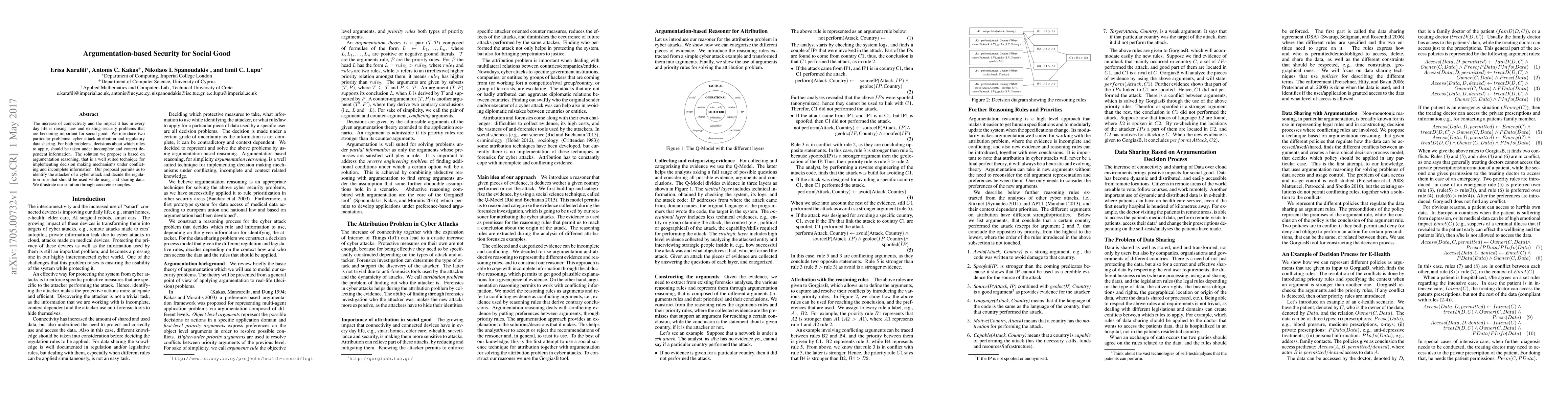 The increase of connectivity and the impact it has in every day life is raising new and existing security problems that are becoming important for social good. We introduce two particular problems: cyber attack attribution and regulatory data sharing. For both problems, decisions about which rules to apply, should be taken under incomplete and context dependent information. The solution we propose is based on argumentation reasoning, that is a well suited technique for implementing decision making mechanisms under conflicting and incomplete information. Our proposal permits us to identify the attacker of a cyber attack and decide the regulation rule that should be used while using and sharing data. We illustrate our solution through concrete examples.