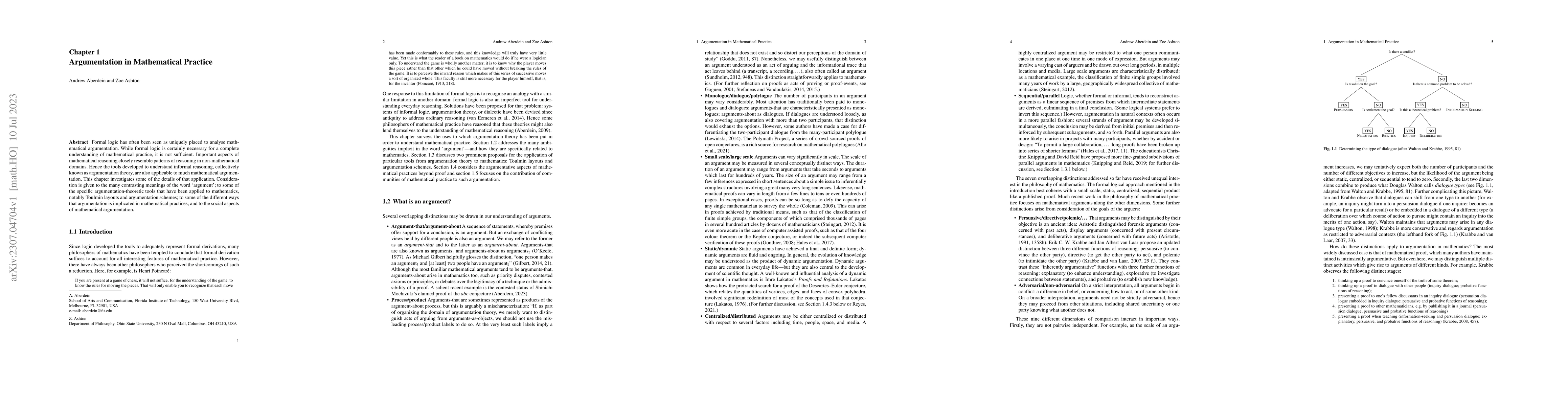 Formal logic has often been seen as uniquely placed to analyze mathematical argumentation. While formal logic is certainly necessary for a complete understanding of mathematical practice, it is not sufficient. Important aspects of mathematical reasoning closely resemble patterns of reasoning in nonmathematical domains. Hence the tools developed to understand informal reasoning, collectively known as argumentation theory, are also applicable to much mathematical argumentation. This chapter investigates some of the details of that application. Consideration is given to the many contrasting meanings of the word ``argument''; to some of the specific argumentation-theoretic tools that have been applied to mathematics, notably Toulmin layouts and argumentation schemes; to some of the different ways that argumentation is implicated in mathematical practices; and to the social aspects of mathematical argumentation.
