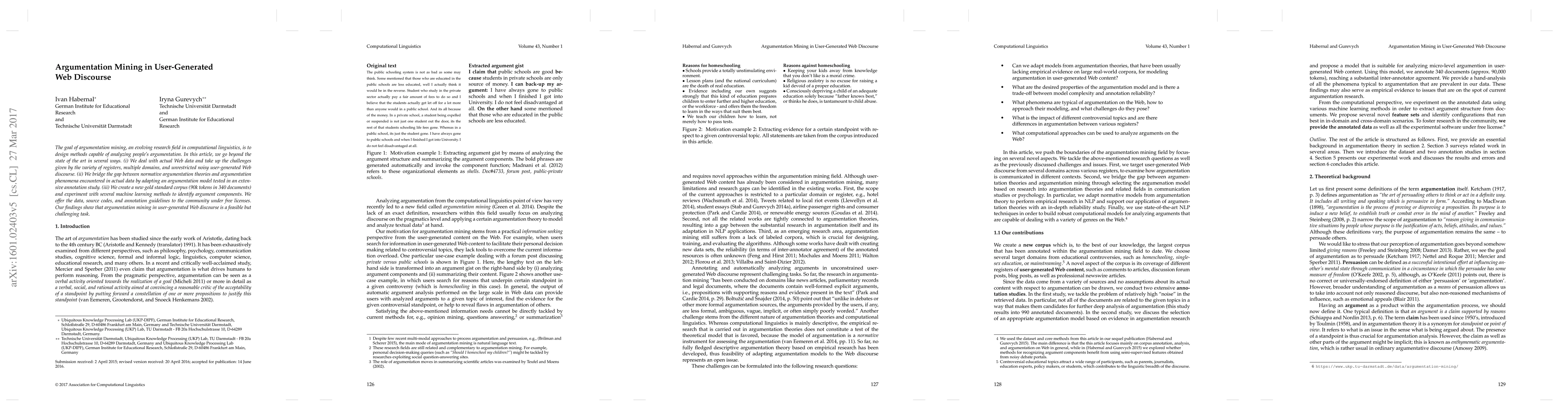 The goal of argumentation mining, an evolving research field in computational linguistics, is to design methods capable of analyzing people's argumentation. In this article, we go beyond the state of the art in several ways. (i) We deal with actual Web data and take up the challenges given by the variety of registers, multiple domains, and unrestricted noisy user-generated Web discourse. (ii) We bridge the gap between normative argumentation theories and argumentation phenomena encountered in actual data by adapting an argumentation model tested in an extensive annotation study. (iii) We create a new gold standard corpus (90k tokens in 340 documents) and experiment with several machine learning methods to identify argument components. We offer the data, source codes, and annotation guidelines to the community under free licenses. Our findings show that argumentation mining in user-generated Web discourse is a feasible but challenging task.