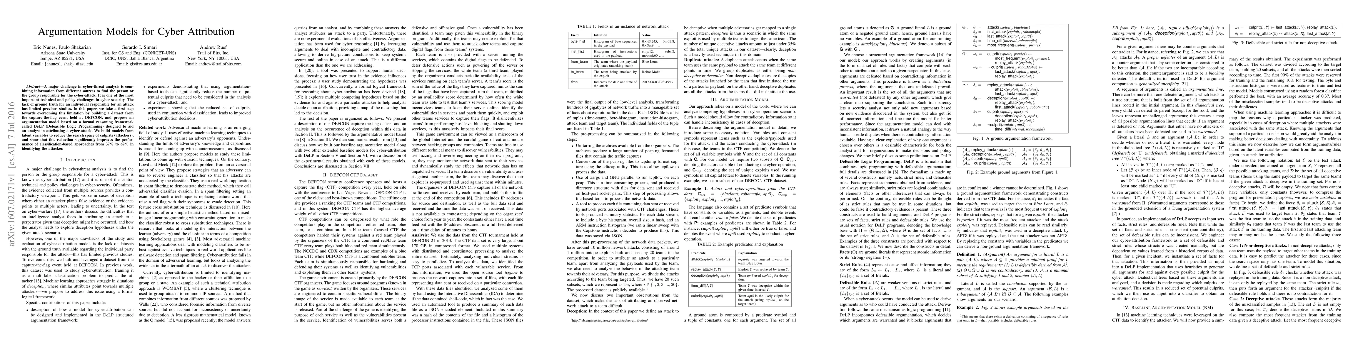 A major challenge in cyber-threat analysis is combining information from different sources to find the person or the group responsible for the cyber-attack. It is one of the most important technical and policy challenges in cyber-security. The lack of ground truth for an individual responsible for an attack has limited previous studies. In this paper, we take a first step towards overcoming this limitation by building a dataset from the capture-the-flag event held at DEFCON, and propose an argumentation model based on a formal reasoning framework called DeLP (Defeasible Logic Programming) designed to aid an analyst in attributing a cyber-attack. We build models from latent variables to reduce the search space of culprits (attackers), and show that this reduction significantly improves the performance of classification-based approaches from 37% to 62% in identifying the attacker.
