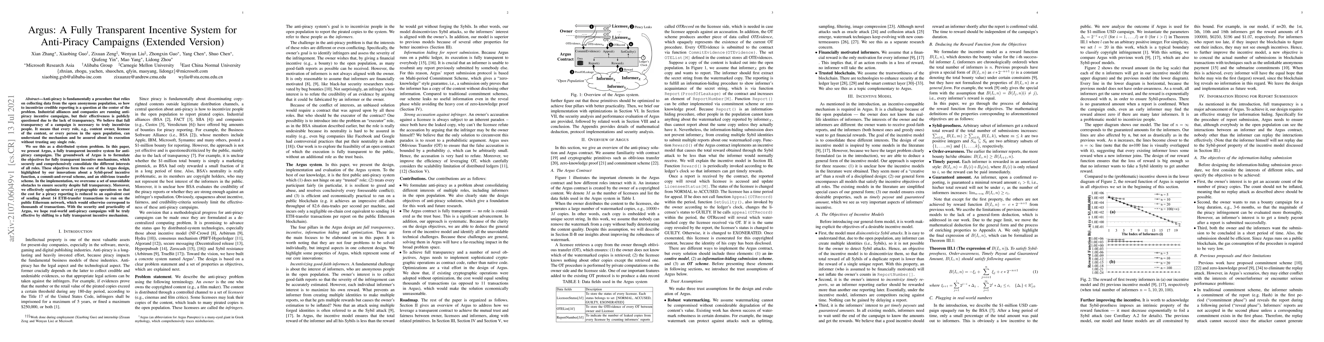Argus is a fully transparent incentive system designed to enhance the effectiveness of anti-piracy campaigns by ensuring all participants understand and trust the mechanisms. It achieves security and transparency through innovative cryptographic techniques, reducing the cost of reporting piracy to a minimal level.