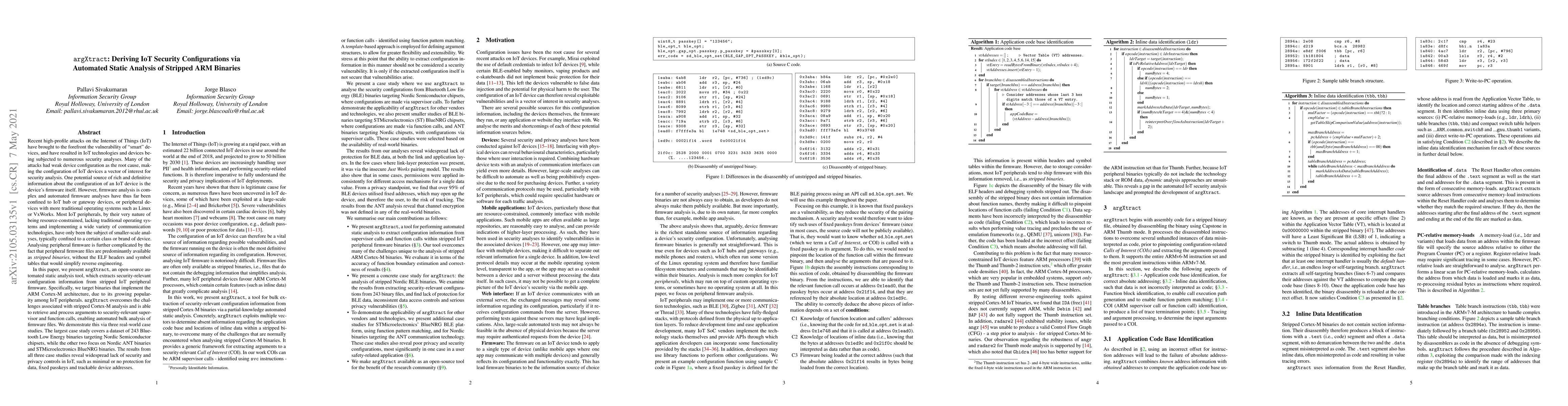 argXtract is an automated static analysis tool designed to extract security-relevant configuration information from stripped ARM Cortex-M binaries used in IoT devices. It demonstrates effectiveness through real-world case studies, revealing widespread security and privacy deficiencies in IoT firmware.