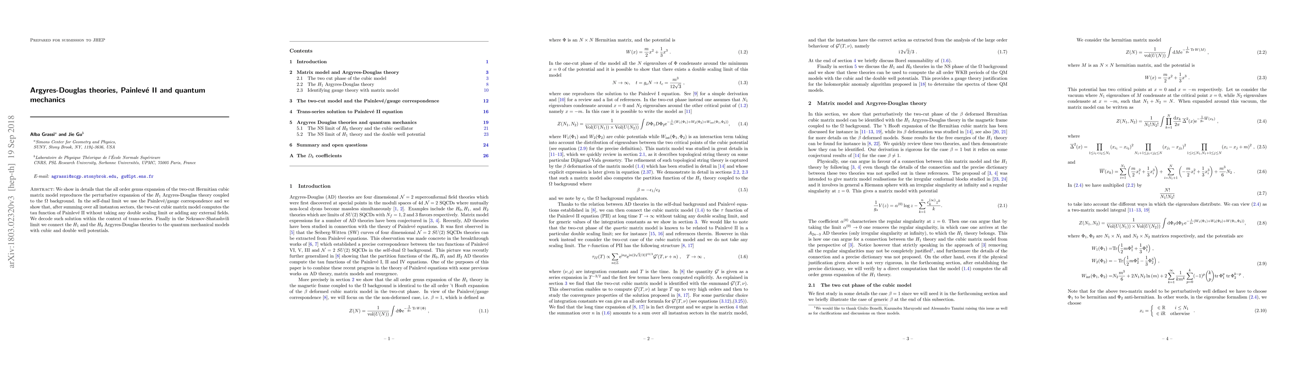 We show in details that the all-orders genus expansion of the two-cut Hermitian cubic matrix model reproduces the perturbative expansion of the $H_1$ Argyres-Douglas theory coupled to the $\Omega$ background. In the self-dual limit we use the Painlev\'e/gauge correspondence and we show that, after summing over all instanton sectors, the two-cut cubic matrix model computes the tau function of Painlev\'e II without taking any double scaling limit or adding any external fields. We decode such solution within the context of trans-series. Finally in the Nekrasov-Shatashvili limit we connect the $H_1$ and the $H_0$ Argyres-Douglas theories to the quantum mechanical models with cubic and double well potentials.