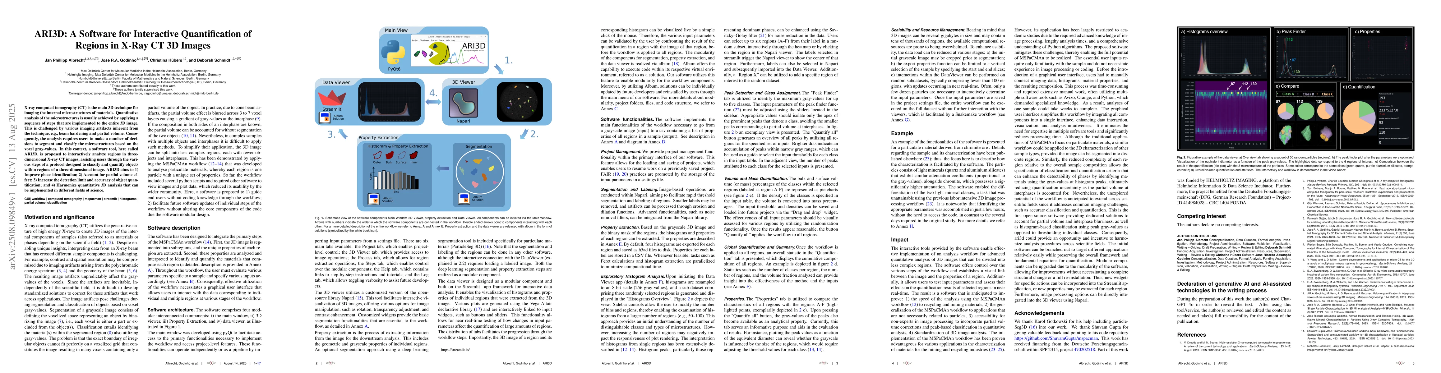 X-ray computed tomography (CT) is the main 3D technique for imaging the internal microstructures of materials. Quantitative analysis of the microstructures is usually achieved by applying a sequence of steps that are implemented to the entire 3D image. This is challenged by various imaging artifacts inherent from the technique, e.g., beam hardening and partial volume. Consequently, the analysis requires users to make a number of decisions to segment and classify the microstructures based on the voxel gray-values. In this context, a software tool, here called ARI3D, is proposed to interactively analyze regions in three-dimensional X-ray CT images, assisting users through the various steps of a protocol designed to classify and quantify objects within regions of a three-dimensional image. ARI3D aims to 1) Improve phase identification; 2) Account for partial volume effect; 3) Increase the detection limit and accuracy of object quantification; and 4) Harmonize quantitative 3D analysis that can be implemented in different fields of science.