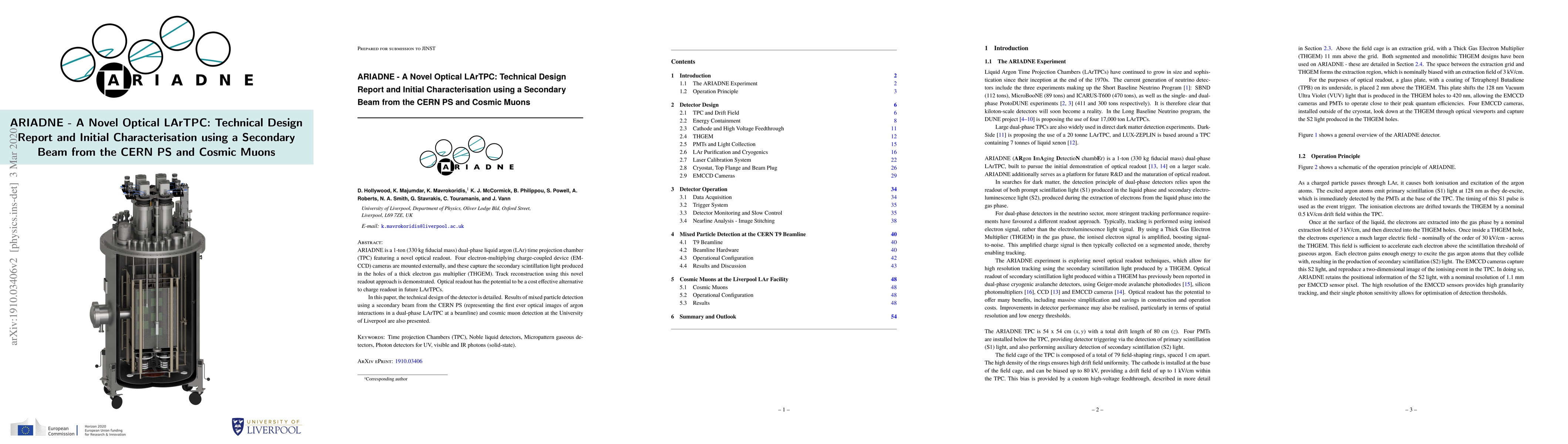 ARIADNE is a novel 1-ton dual-phase liquid argon time projection chamber with an innovative optical readout using EMCCD cameras. Initial characterization using CERN PS secondary beams and cosmic muons demonstrates track reconstruction and potential cost-effective alternatives to traditional charge readout.