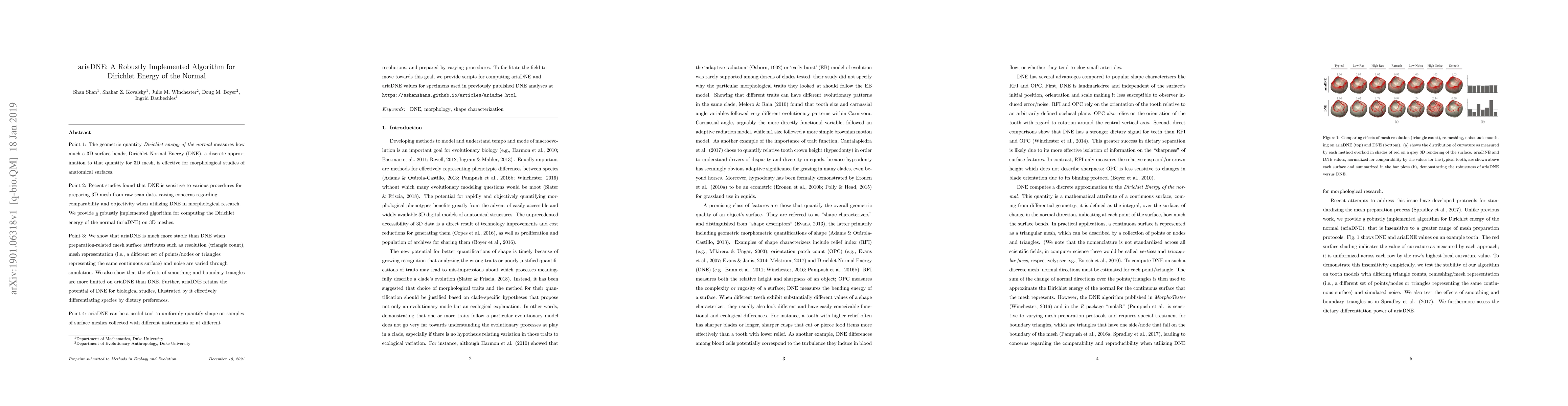 Point 1: Shape characterizers are metrics that quantify aspects of the overall geometry of a 3D digital surface. When computed for biological objects, the values of a shape characterizer are largely independent of homology interpretations and often contain a strong ecological and functional signal. Thus shape characterizers are useful for understanding evolutionary processes. Dirichlet Normal Energy (DNE) is a widely used shape characterizer in morphological studies. Point 2: Recent studies found that DNE is sensitive to various procedures for preparing 3D mesh from raw scan data, raising concerns regarding comparability and objectivity when utilizing DNE in morphological research. We provide a robustly implemented algorithm for computing the Dirichlet energy of the normal (ariaDNE) on 3D meshes. Point 3: We show through simulation that the effects of preparation-related mesh surface attributes such as triangle count, mesh representation, noise, smoothing and boundary triangles are much more limited on ariaDNE than DNE. Furthermore, ariaDNE retains the potential of DNE for biological studies, illustrated by its effectiveness in differentiating species by dietary preferences. Point 4: Use of ariaDNE can dramatically enhance assessment of ecological aspects of morphological variation by its stability under different 3D model acquisition methods and preparation procedure. Towards this goal, we provide scripts for computing ariaDNE and ariaDNE values for specimens used in previously published DNE analyses.