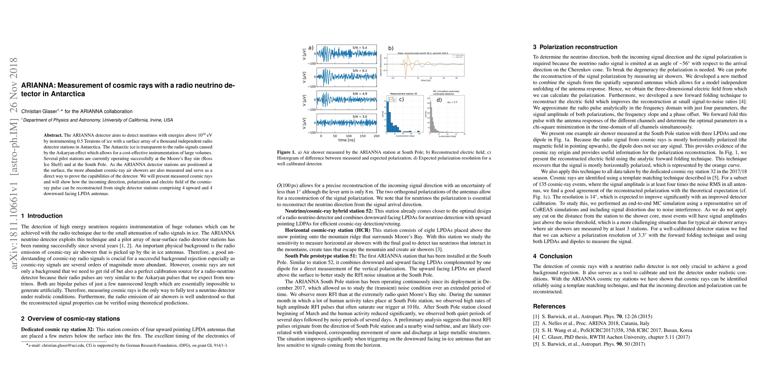 The ARIANNA detector in Antarctica measures cosmic rays and high-energy neutrinos using radio signals from the Askaryan effect in ice. Pilot stations successfully detect cosmic rays, allowing for reconstruction of their direction, polarization, and electric field.