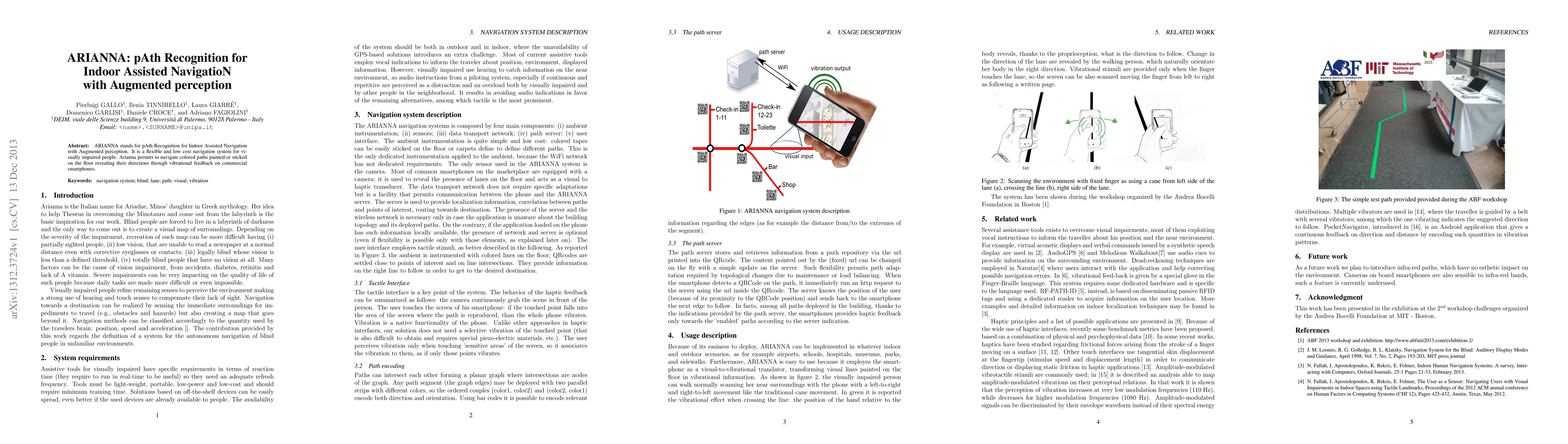 Summary: ARIANNA is a cost-effective navigation system for visually impaired individuals, utilizing colored paths and vibrational feedback on smartphones to guide users along marked routes. It aims to provide flexible indoor assistance through augmented perception.
