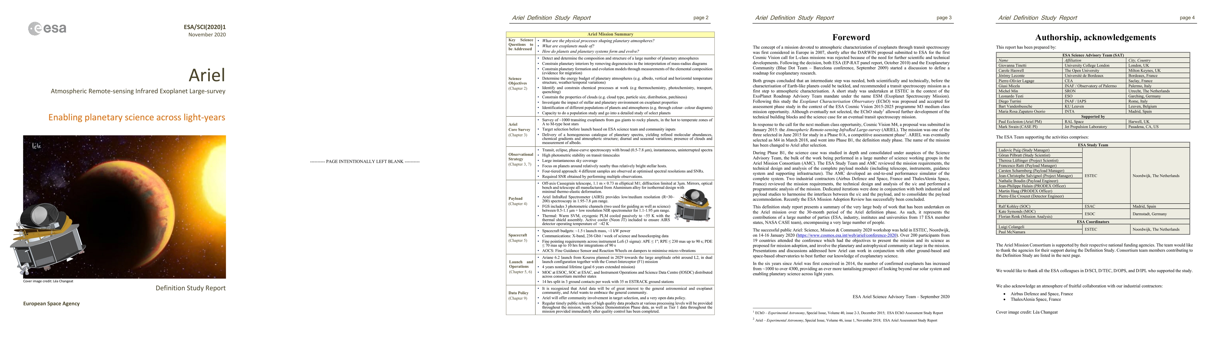 Ariel, the Atmospheric Remote-sensing Infrared Exoplanet Large-survey, was adopted as the fourth medium-class mission in ESA's Cosmic Vision programme to be launched in 2029. During its 4-year mission, Ariel will study what exoplanets are made of, how they formed and how they evolve, by surveying a diverse sample of about 1000 extrasolar planets, simultaneously in visible and infrared wavelengths. It is the first mission dedicated to measuring the chemical composition and thermal structures of hundreds of transiting exoplanets, enabling planetary science far beyond the boundaries of the Solar System. The payload consists of an off-axis Cassegrain telescope (primary mirror 1100 mm x 730 mm ellipse) and two separate instruments (FGS and AIRS) covering simultaneously 0.5-7.8 micron spectral range. The satellite is best placed into an L2 orbit to maximise the thermal stability and the field of regard. The payload module is passively cooled via a series of V-Groove radiators; the detectors for the AIRS are the only items that require active cooling via an active Ne JT cooler. The Ariel payload is developed by a consortium of more than 50 institutes from 16 ESA countries, which include the UK, France, Italy, Belgium, Poland, Spain, Austria, Denmark, Ireland, Portugal, Czech Republic, Hungary, the Netherlands, Sweden, Norway, Estonia, and a NASA contribution.
