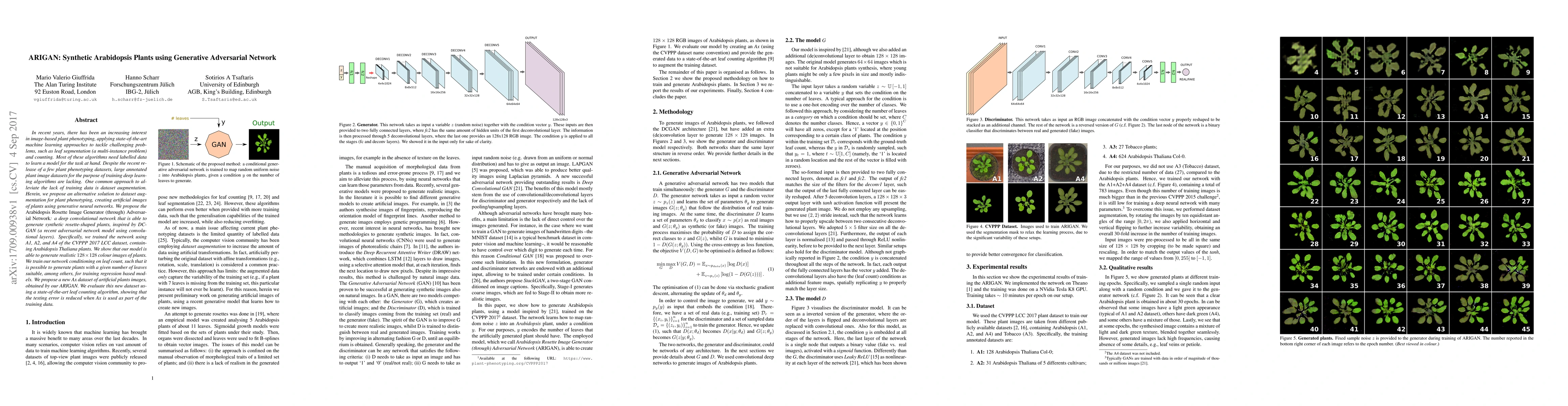 The paper proposes ARIGAN, a generative adversarial network to create synthetic Arabidopsis plants, addressing the scarcity of large annotated plant image datasets. The model generates realistic 128x128 colour images conditioned on leaf count, and its synthetic dataset improves leaf counting model performance when used for training.