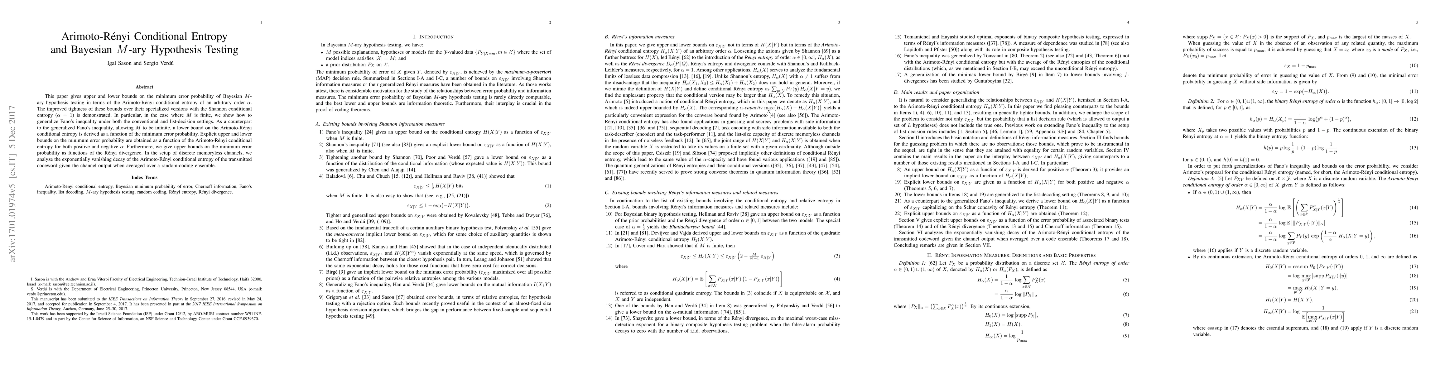 This paper establishes upper and lower bounds on the minimum error probability for Bayesian $M$-ary hypothesis testing using the Arimoto-Rényi conditional entropy, demonstrating improved bounds compared to Shannon entropy. It generalizes Fano's inequality for finite $M$ and provides a lower bound for infinite $M$ in terms of the Arimoto-Rényi entropy.