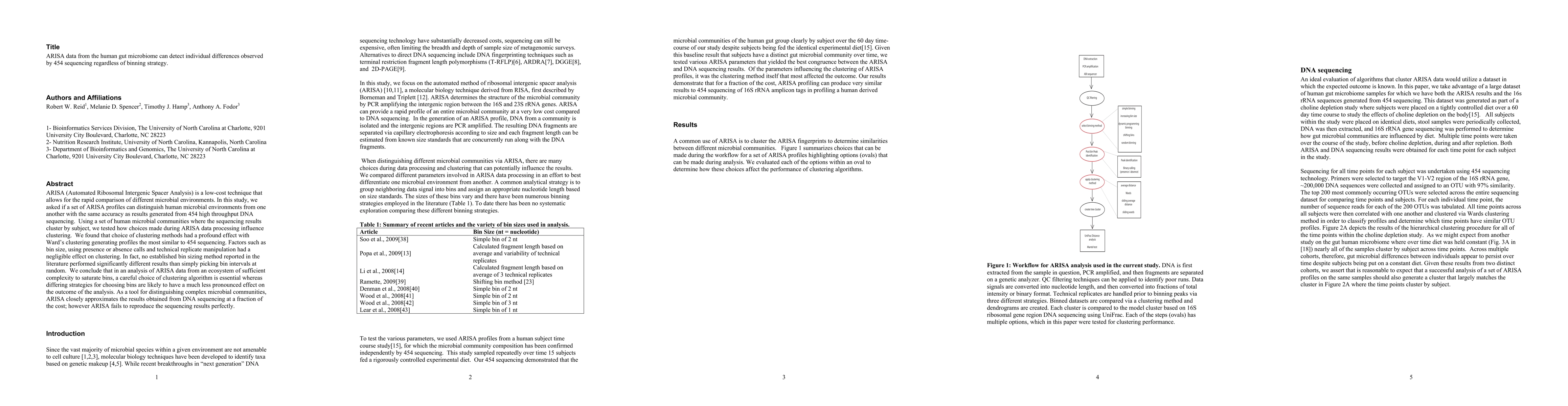ARISA (Automated Ribosomal Intergenic Spacer Analysis) is a low-cost technique that allows for the rapid comparison of different microbial environments. In this study, we asked if a set of ARISA profiles can distinguish human microbial environments from one another with the same accuracy as results generated from 454 high throughput DNA sequencing. Using a set of human microbial communities where the sequencing results cluster by subject, we tested how choices made during ARISA data processing influence clustering. We found that choice of clustering methods had a profound effect with Ward's clustering generating profiles the most similar to 454 sequencing. Factors such as bin size, using presence or absence calls and technical replicate manipulation had a negligible effect on clustering. In fact, no established bin sizing method reported in the literature performed significantly different results than simply picking bin intervals at random. We conclude that in an analysis of ARISA data from an ecosystem of sufficient complexity to saturate bins, a careful choice of clustering algorithm is essential whereas differing strategies for choosing bins are likely to have a much less pronounced effect on the outcome of the analysis. As a tool for distinguishing complex microbial communities, ARISA closely approximates the results obtained from DNA sequencing at a fraction of the cost; however ARISA fails to reproduce the sequencing results perfectly.