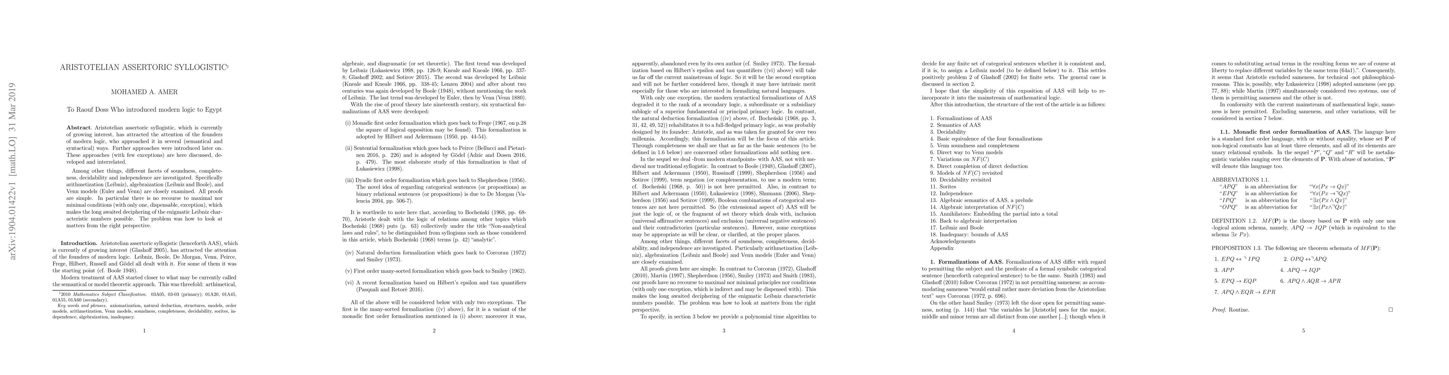 This paper discusses various modern approaches to Aristotelian assertoric syllogistic, interlinking them and examining soundness, completeness, decidability, and independence. It simplifies proofs, enabling understanding of Leibniz's characteristic numbers without resorting to maximal or minimal conditions.