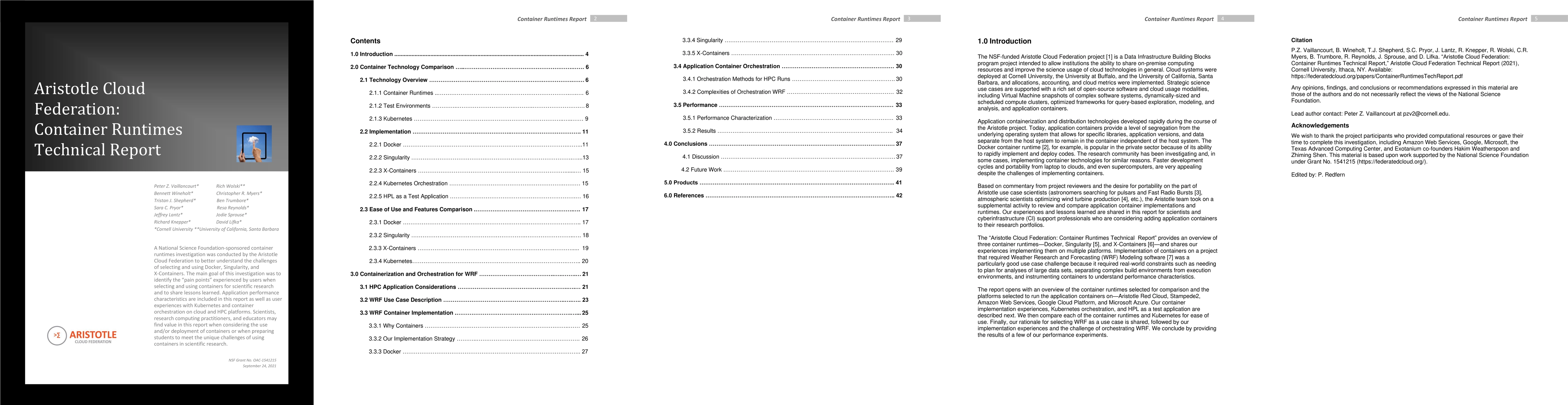 This report investigates container runtimes like Docker, Singularity, and X-Containers to identify user challenges and performance issues in scientific research. It highlights lessons learned and experiences with Kubernetes on cloud and HPC platforms, providing valuable insights for scientists and educators.
