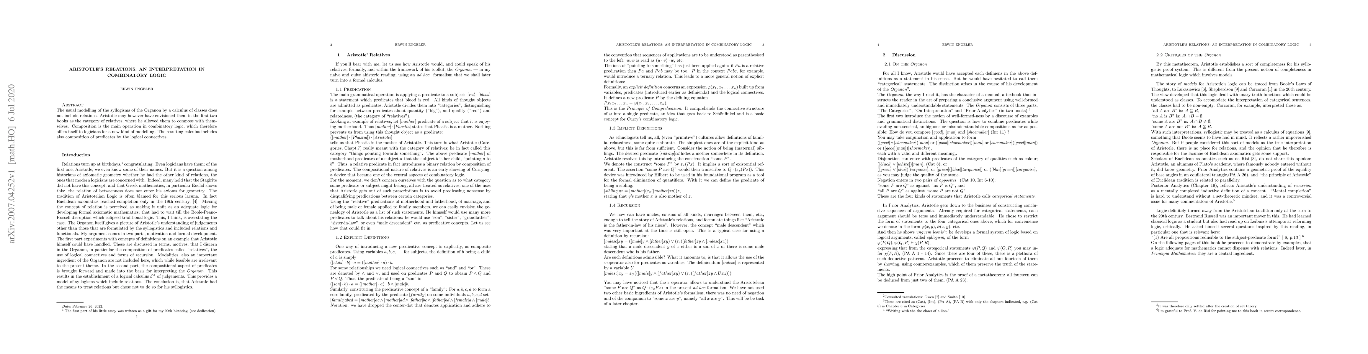 This paper explores how combinatory logic can model Aristotle's syllogisms, introducing relations as a key operation that combines with themselves, and including composition of predicates with logical connectives.