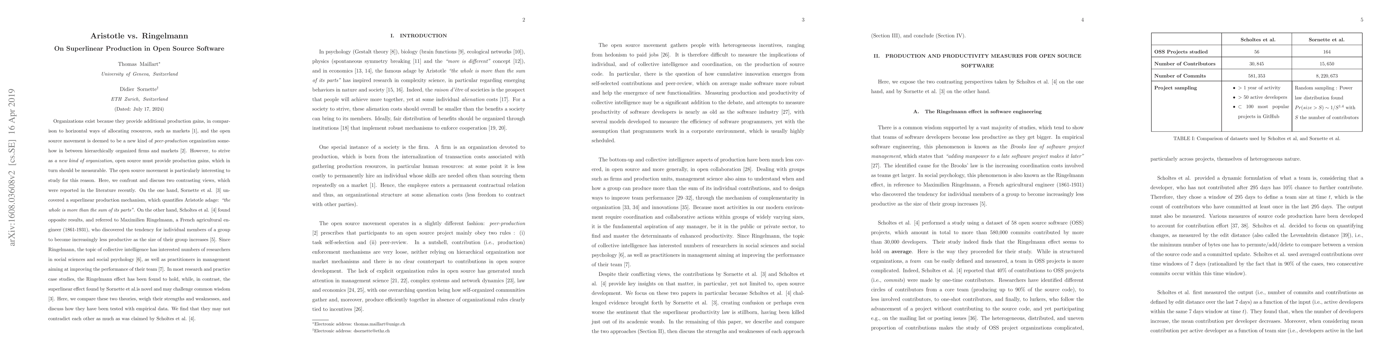 Organizations exist because they provide additional production gains, in comparison to horizontal ways of allocating resources, such as markets, and the open source movement is deemed to be a new kind of peer-production organization somehow in between hierarchically organized firms and markets. However, to strive as a new kind of organization, open source must provide production gains, which in turn should be measurable. The open source movement is particularly interesting to study for this reason. Here, we confront and discuss two contrasting views, which were reported in the literature recently. On the one hand, Sornette et al. uncovered a superlinear production mechanism, which quantifies Aristotle adage: `the whole is more than the sum of its parts'. On the other hand, Scholtes et al. found opposite results, and referred to Maximilien Ringelmann, a French agricultural engineer (1861-1931), who discovered the tendency for individual members of a group to become increasingly less productive as the size of their group increases. Since Ringelmann, the topic of collective intelligence has interested numbers of researchers in social sciences and social psychology, as well as practitioners in management aiming at improving the performance of their team. In most research and practice case studies, the Ringelmann effect has been found to hold, while, in contrast, the superlinear effect found by Sornette et al.is novel and may challenge common wisdom. Here, we compare these two theories, weigh their strengths and weaknesses, and discuss how they have been tested with empirical data. We find that they may not contradict each other as much as was claimed by Scholtes et al.