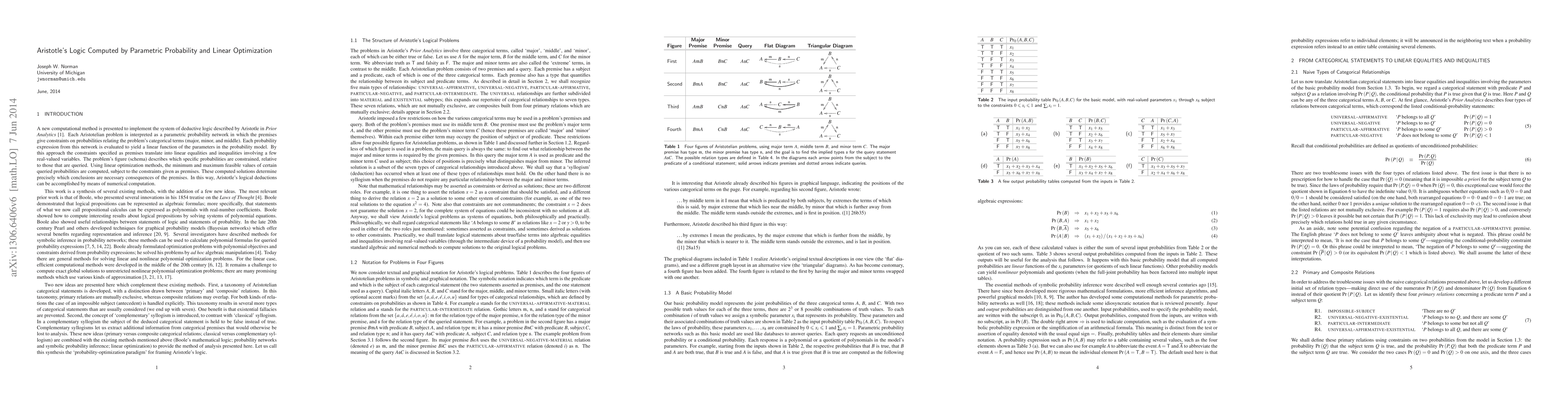 A new computational method is presented to implement the system of deductive logic described by Aristotle in Prior Analytics. Each Aristotelian problem is interpreted as a parametric probability network in which the premises give constraints on probabilities relating the problem's categorical terms (major, minor, and middle). Each probability expression from this network is evaluated to yield a linear function of the parameters in the probability model. By this approach the constraints specified as premises translate into linear equalities and inequalities involving a few real-valued variables. The problem's figure (schema) describes which specific probabilities are constrained, relative to those that are queried. Using linear optimization methods, the minimum and maximum feasible values of certain queried probabilities are computed, subject to the constraints given as premises. These computed solutions determine precisely which conclusions are necessary consequences of the premises. In this way, Aristotle's logical deductions can be accomplished by means of numerical computation.