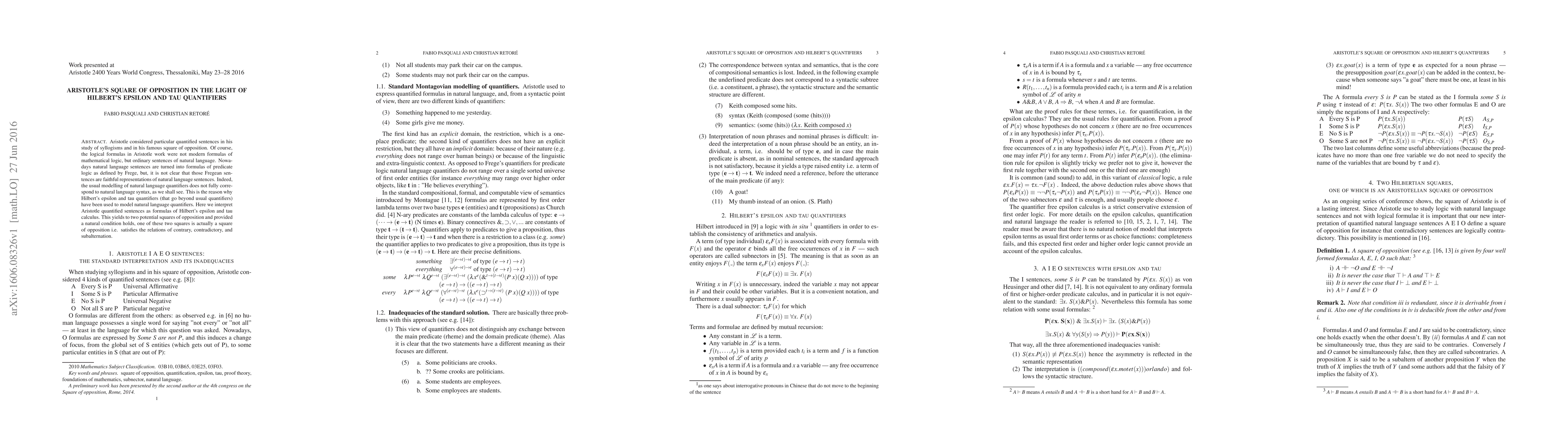 Aristotle considered particular quantified sentences in his study of syllogisms and in his famous square of opposition. Of course, the logical formulas in Aristotle work were not modern formulas of mathematical logic, but ordinary sentences of natural language. Nowadays natural language sentences are turned into formulas of predicate logic as defined by Frege, but, it is not clear that those Fregean sentences are faithful representations of natural language sentences. Indeed, the usual modelling of natural language quantifiers does not fully correspond to natural language syntax, as we shall see. This is the reason why Hilbert's epsilon and tau quantifiers (that go beyond usual quantifiers) have been used to model natural language quantifiers. Here we interpret Aristotle quantified sentences as formulas of Hilbert's epsilon and tau calculus. This yields to two potential squares of opposition and provided a natural condition holds, one of these two squares is actually a square of opposition i.e. satisfies the relations of contrary, contradictory, and subalternation.