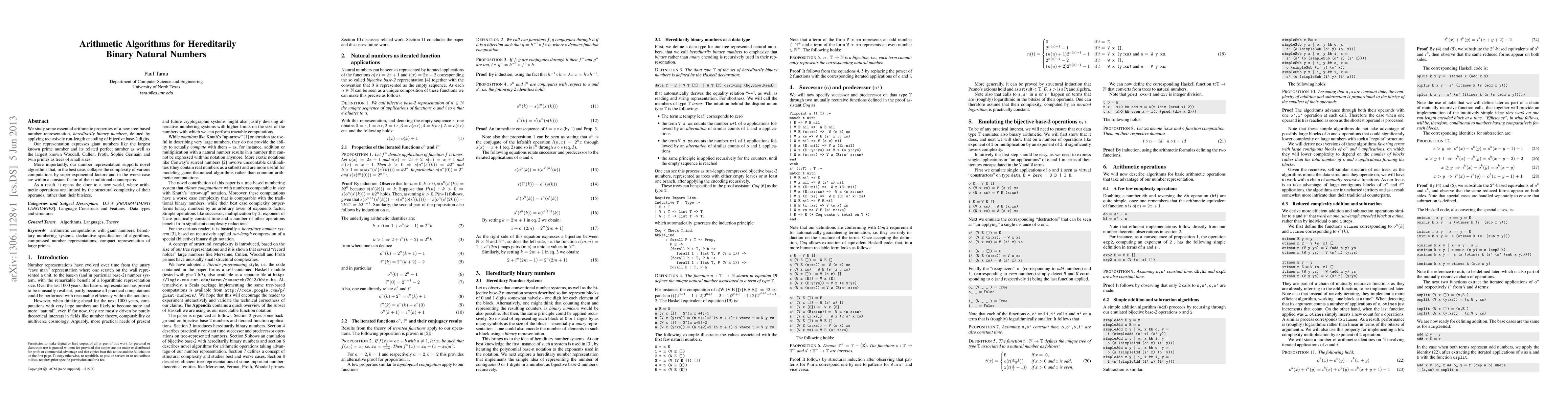 We study some essential arithmetic properties of a new tree-based number representation, {\em hereditarily binary numbers}, defined by applying recursively run-length encoding of bijective base-2 digits. Our representation expresses giant numbers like the largest known prime number and its related perfect number as well as the largest known Woodall, Cullen, Proth, Sophie Germain and twin primes as trees of small sizes. More importantly, our number representation supports novel algorithms that, in the best case, collapse the complexity of various computations by super-exponential factors and in the worse case are within a constant factor of their traditional counterparts. As a result, it opens the door to a new world, where arithmetic operations are limited by the structural complexity of their operands, rather than their bitsizes.