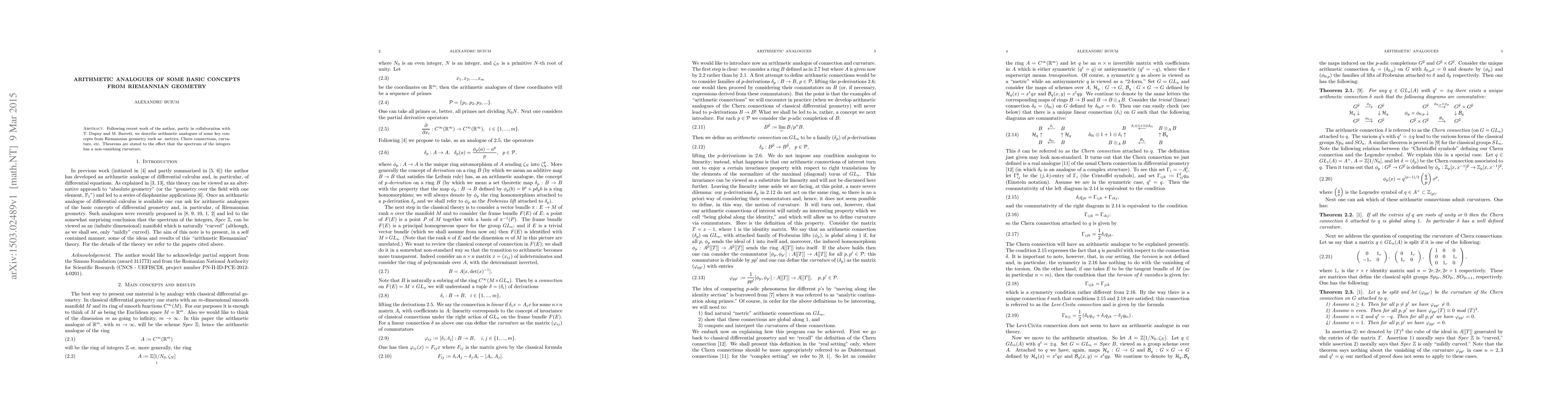 This paper explores arithmetic analogues of fundamental Riemannian geometry concepts like metrics, Chern connections, and curvature, demonstrating that the spectrum of integers exhibits non-vanishing curvature. The work builds on previous collaborative research with T. Dupuy and M. Barrett.