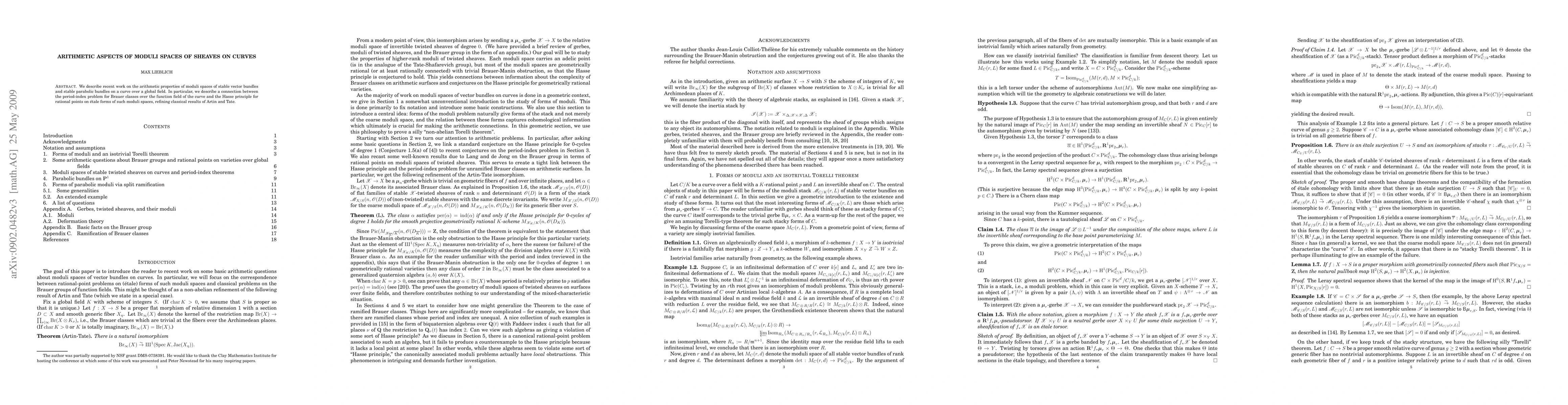 This paper explores the arithmetic properties of moduli spaces of stable vector and parabolic bundles on curves over global fields, establishing a link between the period-index problem for Brauer classes and the Hasse principle for rational points on étale forms of these moduli spaces, enhancing classical results by Artin and Tate.