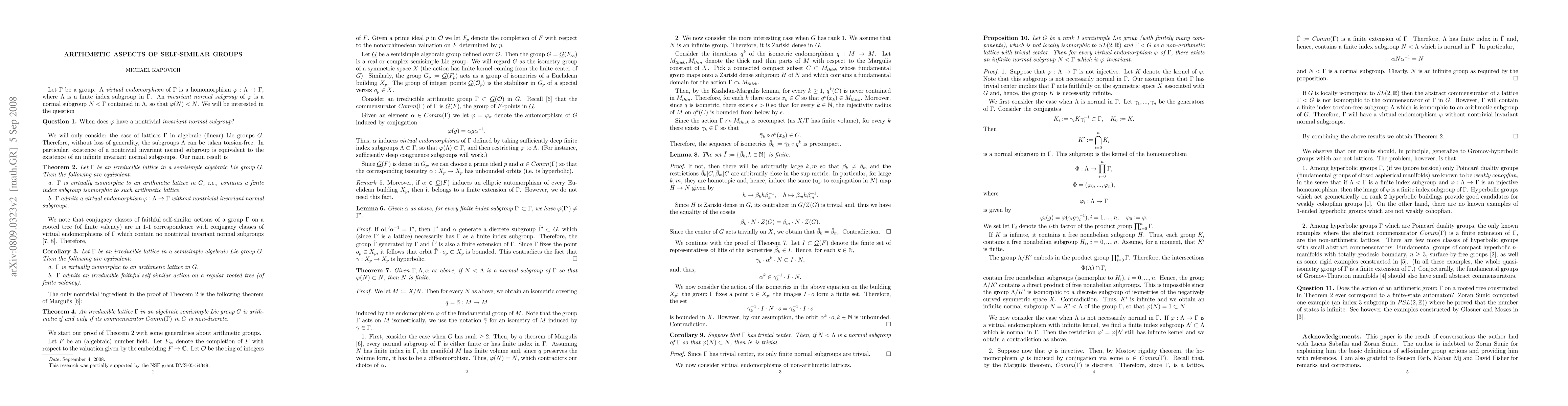 Summary: The paper establishes that irreducible lattices in semisimple algebraic groups are virtually isomorphic to arithmetic lattices if and only if they possess a faithful self-similar action on a rooted tree with finite valency. This connection highlights the structural properties of such lattices.