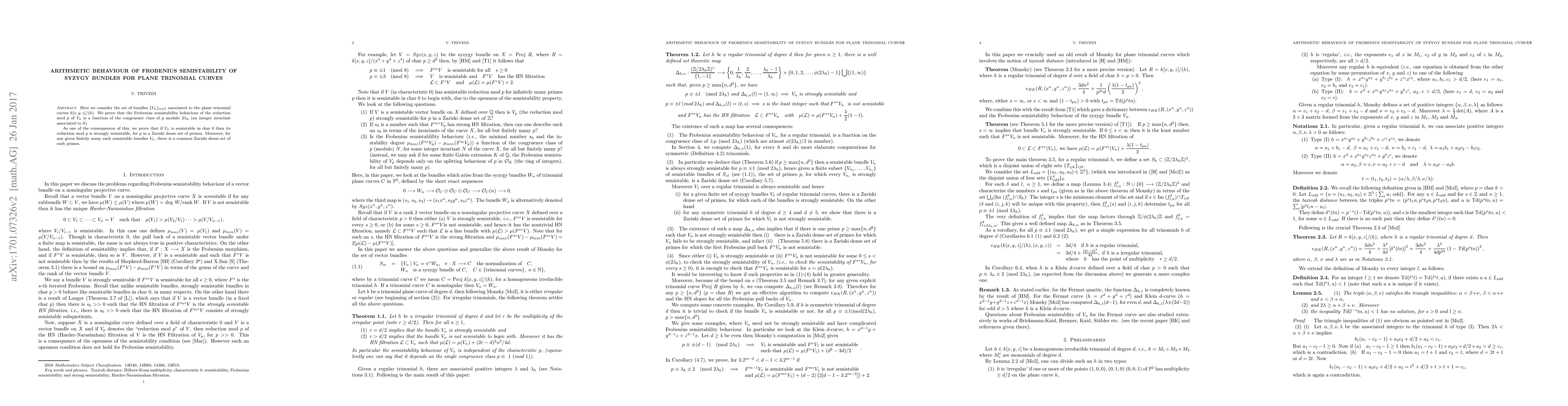 Here we consider the set of bundles $\{V_n\}_{n\geq 1}$ associated to the plane trinomial curves $k[x,y,z]/(h)$. We prove that the Frobenius semistability behaviour of the reduction mod $p$ of $V_n$ is a function of the congruence class of $p$ modulo $2\lambda_h$ (an integer invariant associated to $h$). As one of the consequences of this, we prove that if $V_n$ is semistable in characteristic 0, then its reduction mod $p$ is strongly semistable, for $p$ in a Zariski dense set of primes. Moreover, for any given finitely many such semistable bundles $V_n$, there is a common Zariski dense set of such primes.