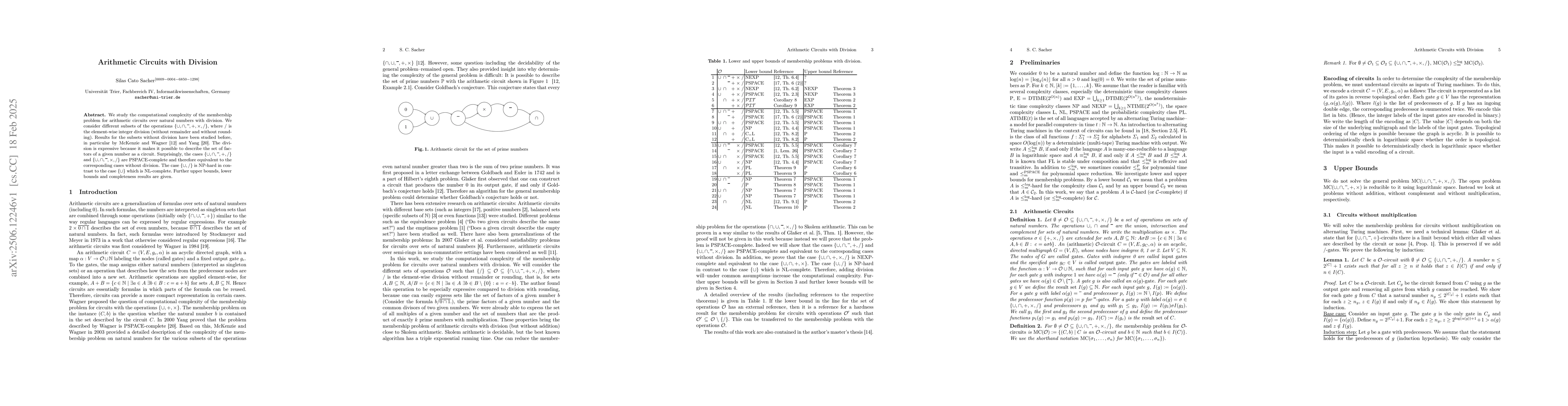 We study the computational complexity of the membership problem for arithmetic circuits over natural numbers with division. We consider different subsets of the operations {intersection,union,complement,+,x,/}, where / is the element-wise integer division (without remainder and without rounding). Results for the subsets without division have been studied before, in particular by McKenzie and Wagner and Yang. The division is expressive because it makes it possible to describe the set of factors of a given number as a circuit. Surprisingly, the cases {intersection,union,complement,+,/} and {intersection,union,complement,x,/} are PSPACE-complete and therefore equivalent to the corresponding cases without division. The case {union,/} is NP-hard in contrast to the case {union} which is NL-complete. Further upper bounds, lower bounds and completeness results are given.
