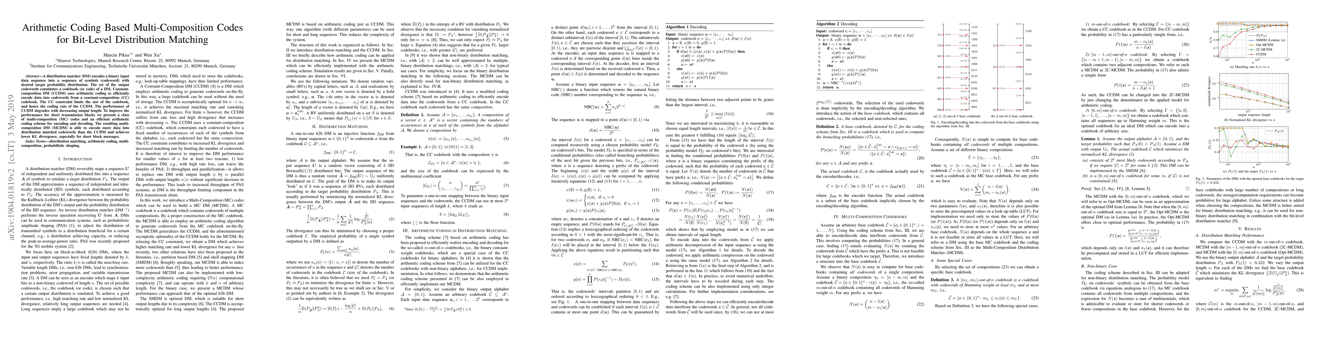 A distribution matcher (DM) encodes a binary input data sequence into a sequence of symbols (codeword) with desired target probability distribution. The set of the output codewords constitutes a codebook (or code) of a DM. Constant-composition DM (CCDM) uses arithmetic coding to efficiently encode data into codewords from a constant-composition (CC) codebook. The CC constraint limits the size of the codebook, and hence the coding rate of the CCDM. The performance of CCDM degrades with decreasing output length. To improve the performance for short transmission blocks we present a class of multi-composition (MC) codes and an efficient arithmetic coding scheme for encoding and decoding. The resulting multi-composition DM (MCDM) is able to encode more data into distribution matched codewords than the CCDM and achieves lower KL divergence, especially for short block messages.