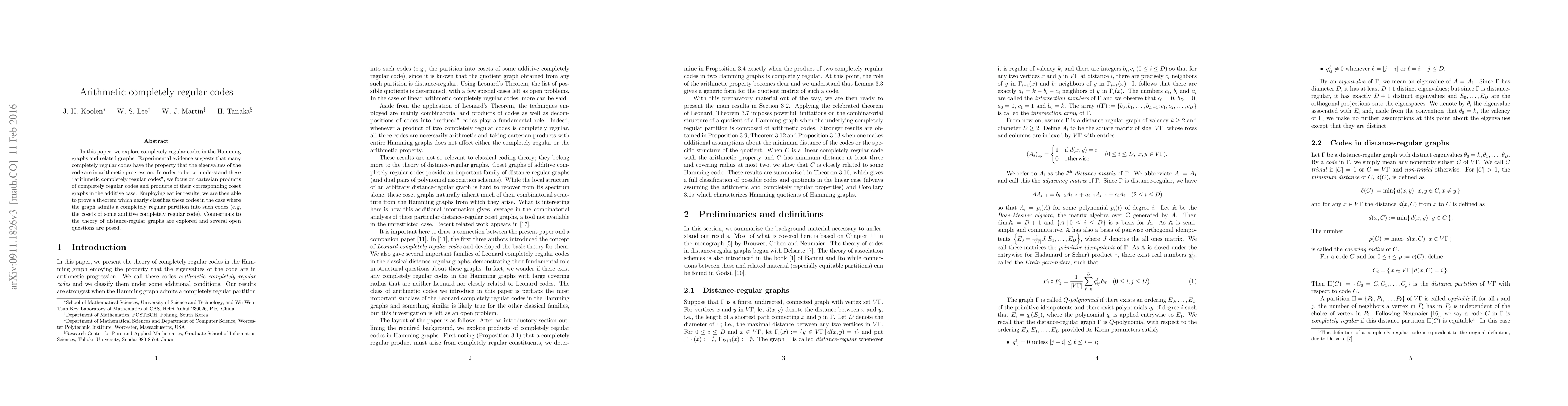 This paper investigates completely regular codes in Hamming graphs, focusing on "arithmetic completely regular codes" whose eigenvalues exhibit arithmetic progression. The authors explore the cartesian products of these codes and their coset graphs, proving a theorem that nearly classifies them under certain conditions, and discuss connections to distance-regular graphs.