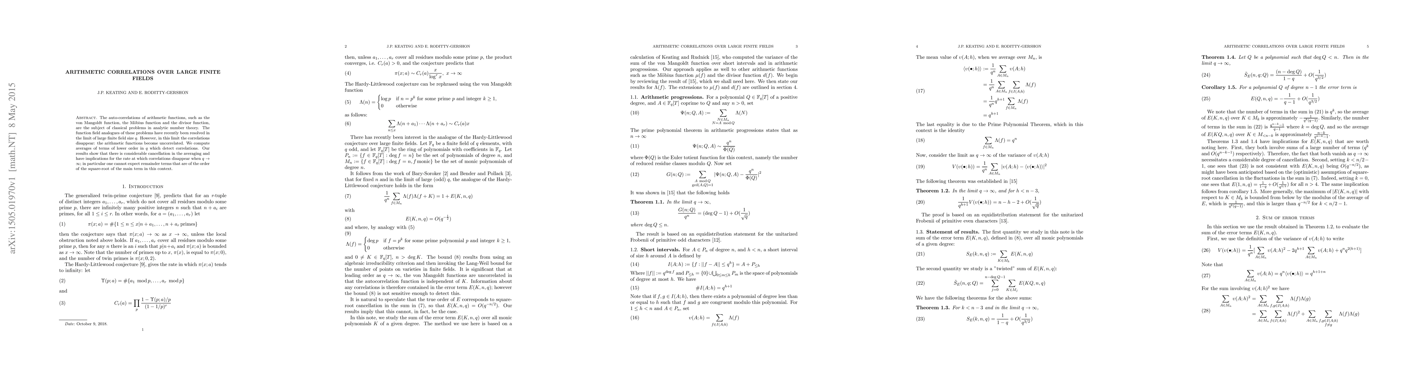 The auto-correlations of arithmetic functions, such as the von Mangoldt function, the M\"obius function and the divisor function, are the subject of classical problems in analytic number theory. The function field analogues of these problems have recently been resolved in the limit of large finite field size $q$. However, in this limit the correlations disappear: the arithmetic functions become uncorrelated. We compute averages of terms of lower order in $q$ which detect correlations. Our results show that there is considerable cancellation in the averaging and have implications for the rate at which correlations disappear when $q \rightarrow\infty$; in particular one cannot expect remainder terms that are of the order of the square-root of the main term in this context.