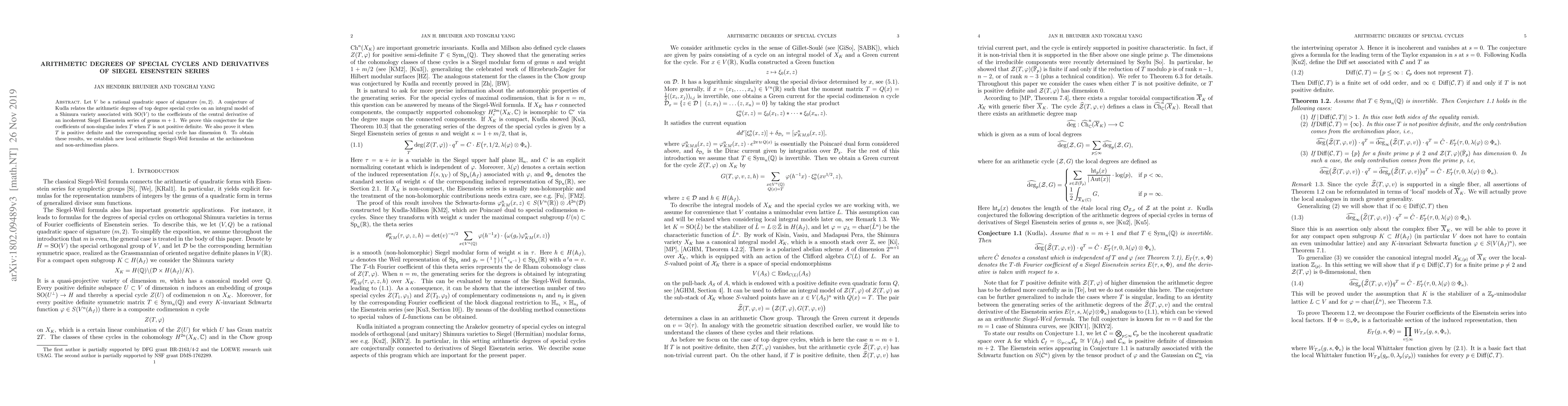 This research confirms Kudla's conjecture linking the arithmetic degrees of special cycles on Shimura varieties to the derivatives of Siegel Eisenstein series, specifically proving it for non-positive definite indices and for zero-dimensional special cycles when positive definite. The study also develops new local arithmetic Siegel-Weil formulas for both archimedean and non-archimedian places.