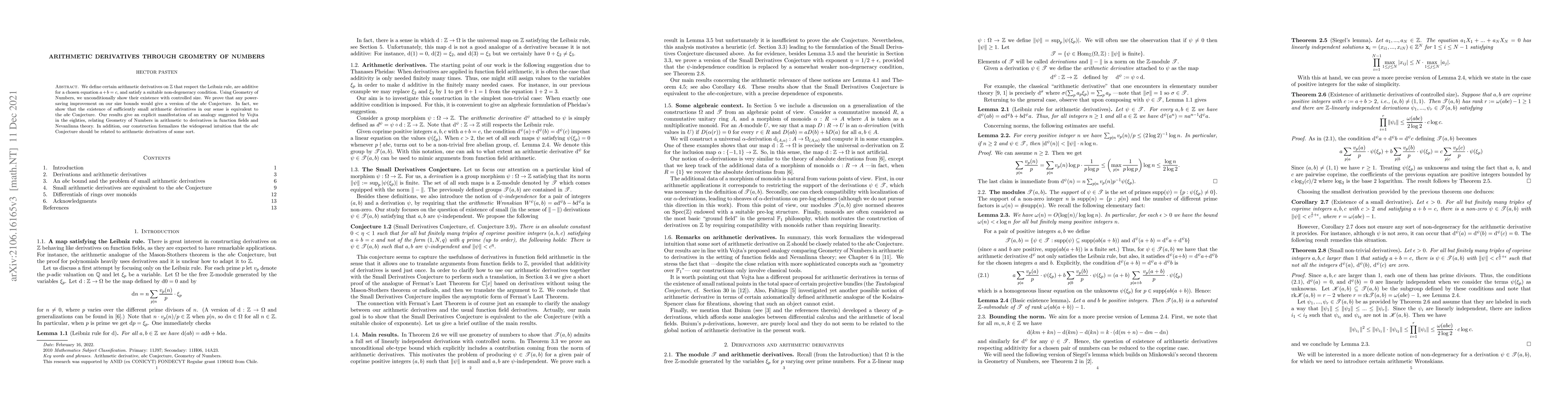 We define certain arithmetic derivatives on $\mathbb{Z}$ that respect the Leibniz rule, are additive for a chosen equation $a+b=c$, and satisfy a suitable non-degeneracy condition. Using Geometry of Numbers, we unconditionally show their existence with controlled size. We prove that any power-saving improvement on our size bounds would give a version of the $abc$ Conjecture. In fact, we show that the existence of sufficiently small arithmetic derivatives in our sense is equivalent to the $abc$ Conjecture. Our results give an explicit manifestation of an analogy suggested by Vojta in the eighties, relating Geometry of Numbers in arithmetic to derivatives in function fields and Nevanlinna theory. In addition, our construction formalizes the widespread intuition that the $abc$ Conjecture should be related to arithmetic derivatives of some sort.